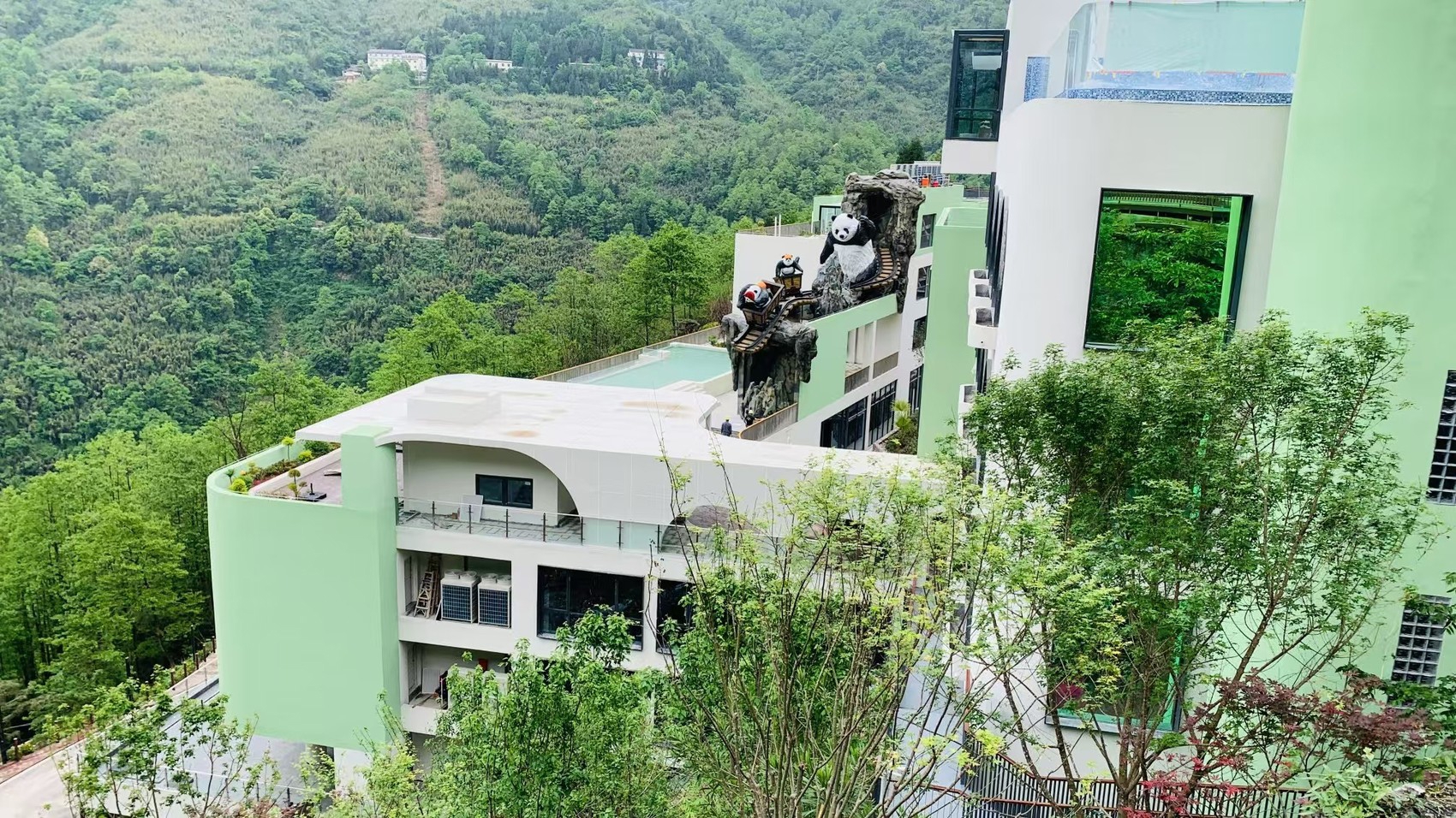 位于华蓥市红岩乡高顶村的乡伴·原舍嘿矿熊猫民宿,挖矿熊猫雕塑与绿色植物相映成趣(受访者供图)