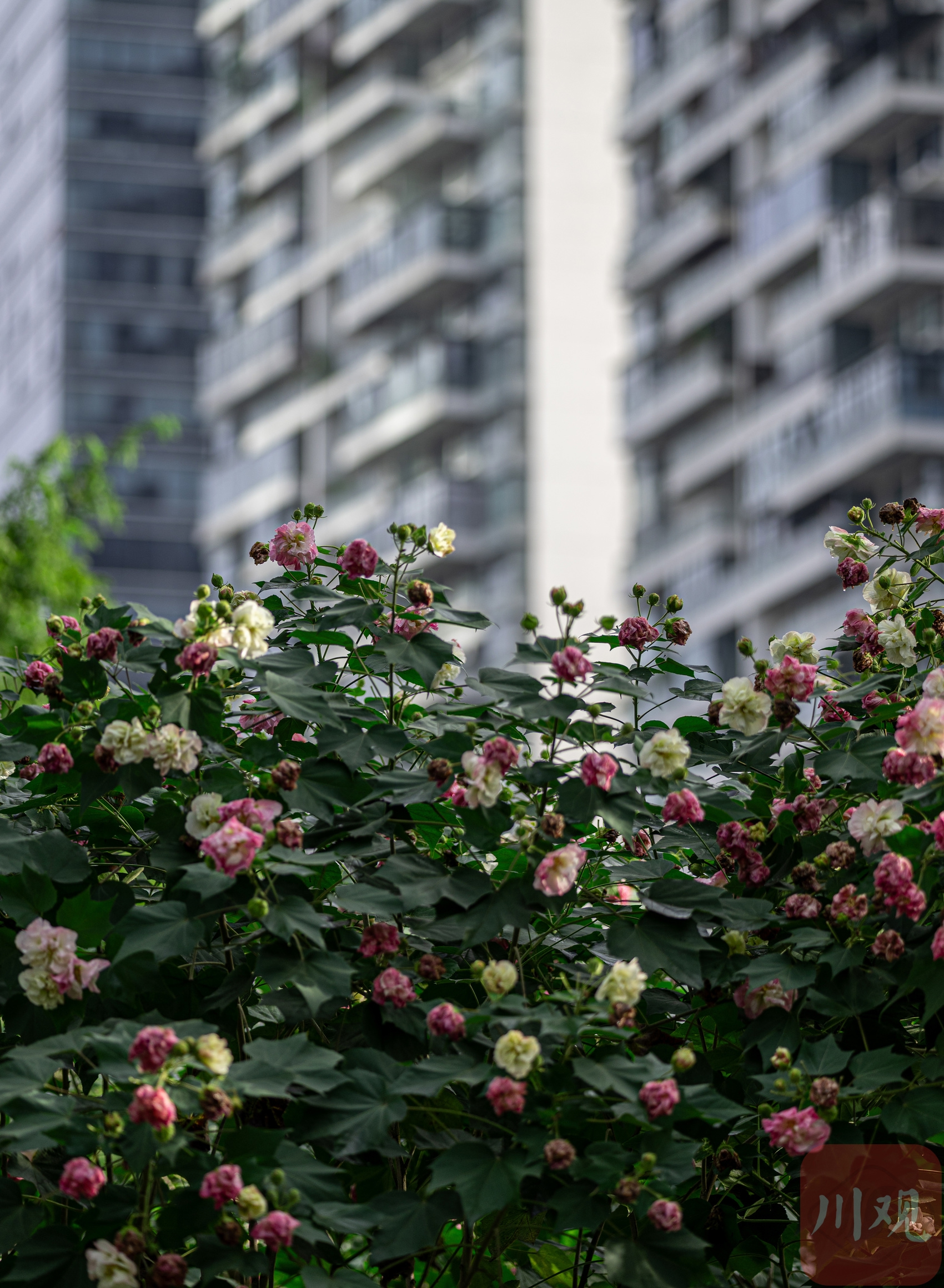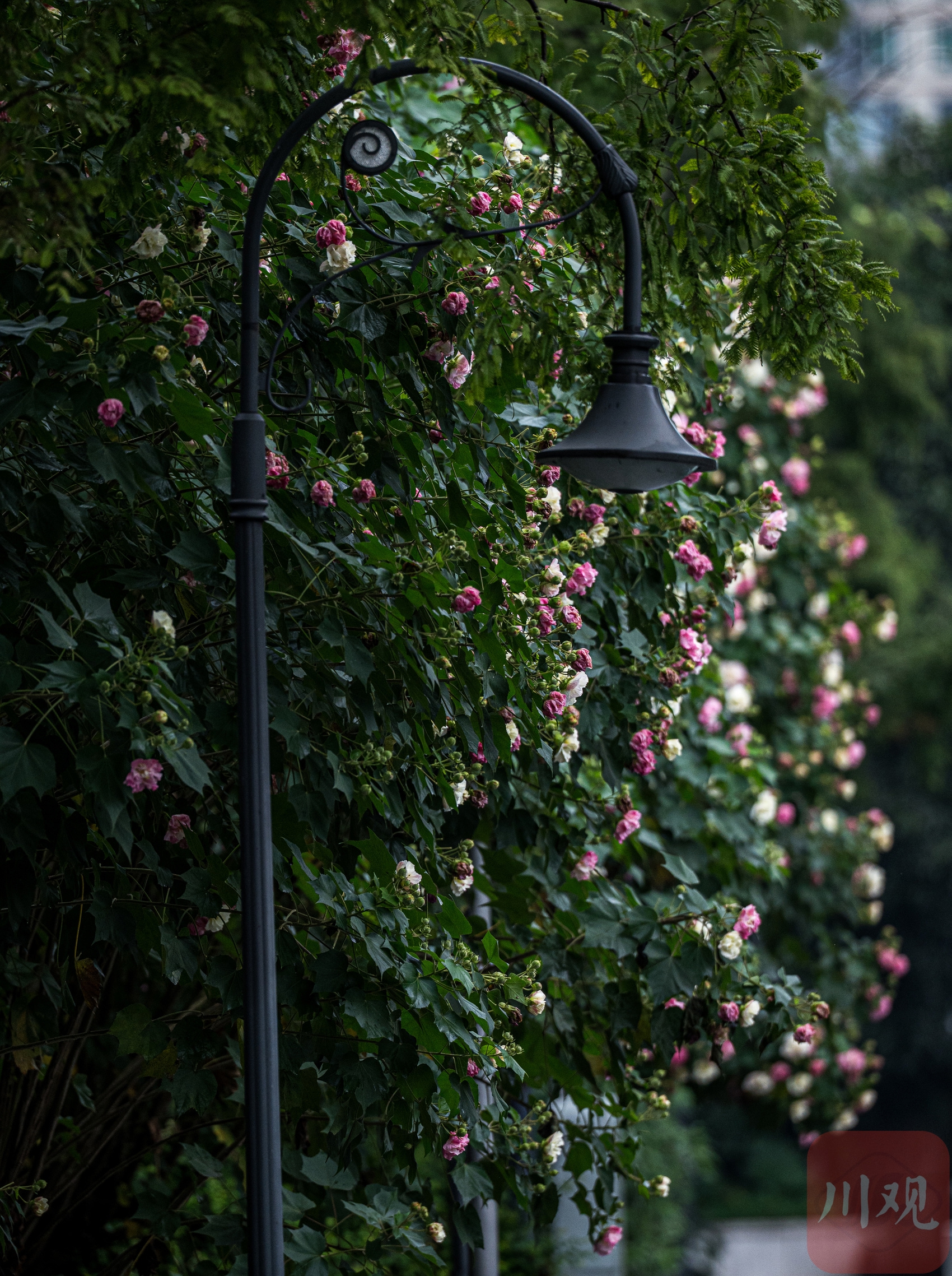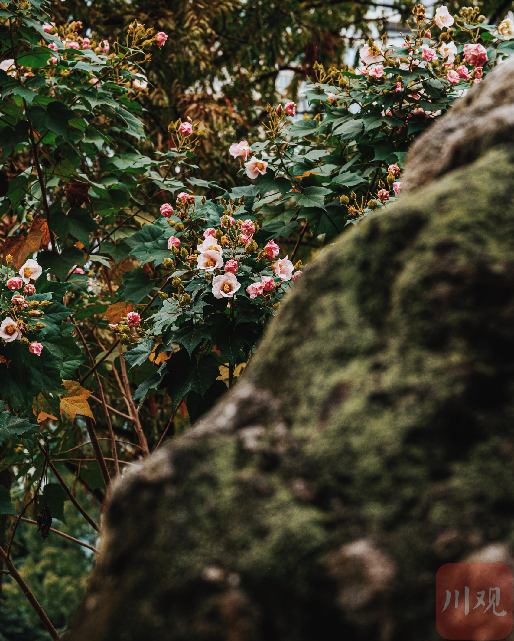 细看雨中芙蓉,更显其独特风韵。花色一日三变,从清晨的素白到黄昏的深红,宛若一场优雅的独舞。这位成都的“老朋友”从不与百花争春,越是寒深露重,越是精神抖擞。雨珠轻缀花瓣,仿佛凝结了千年古城的文脉雅韵。