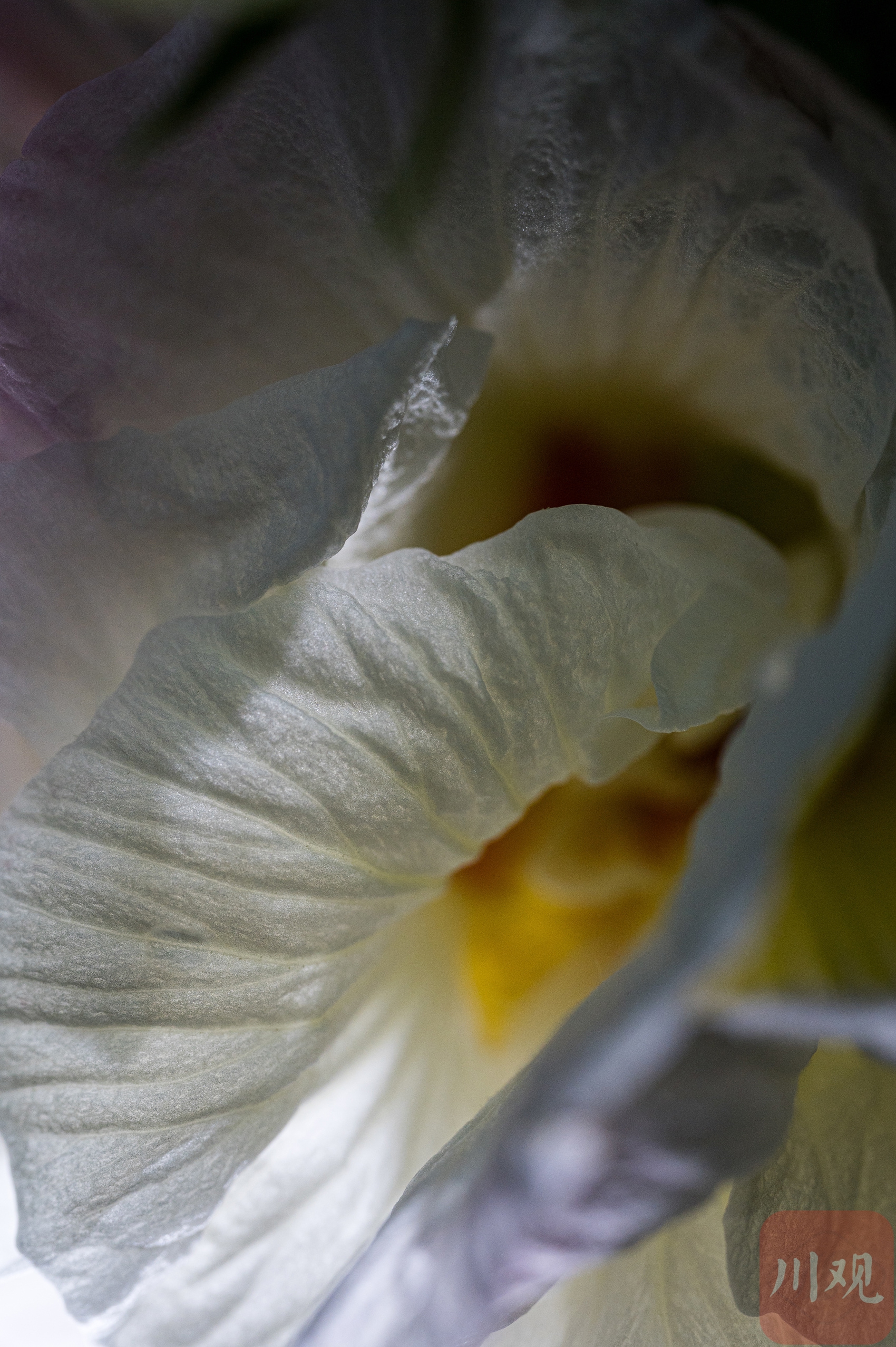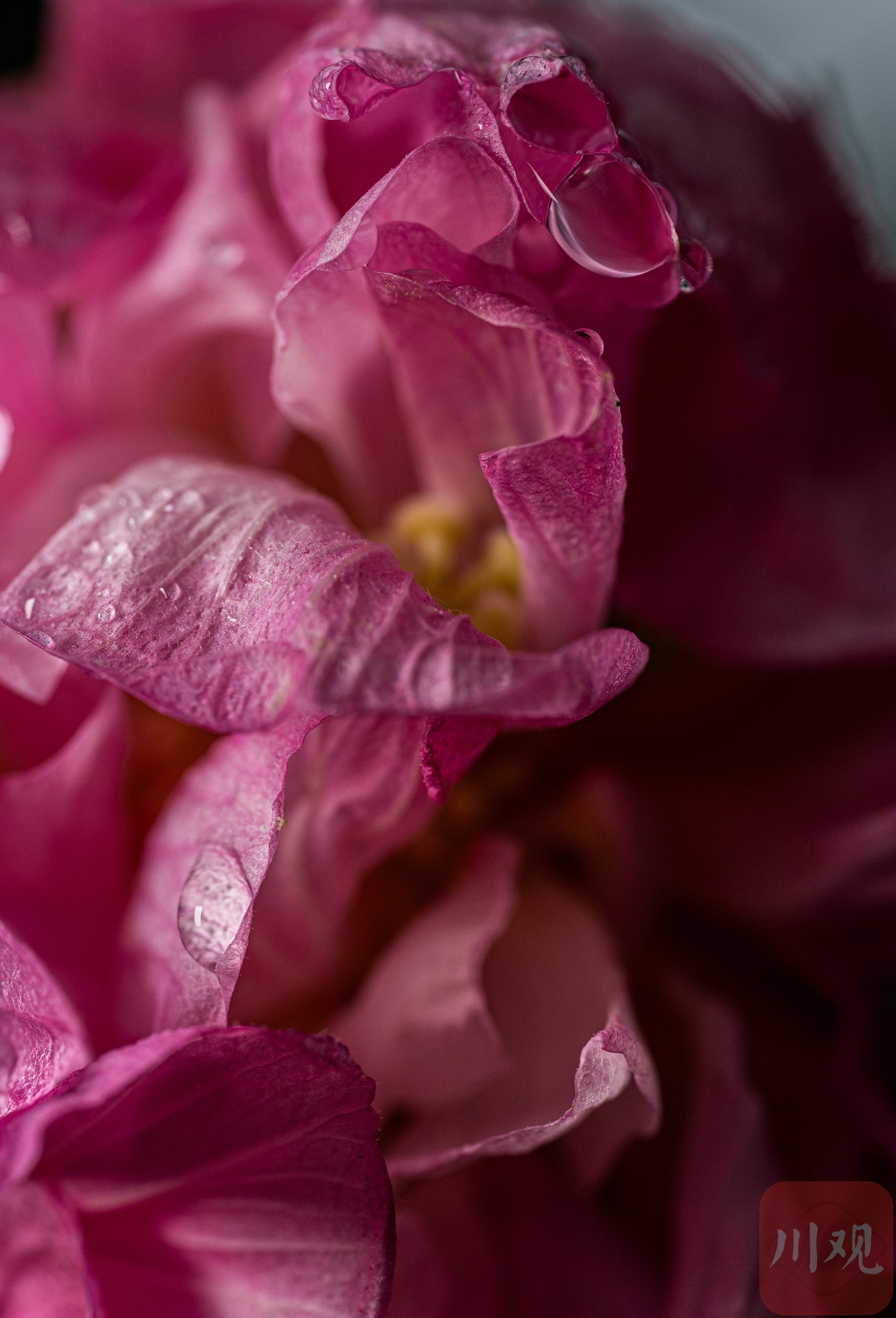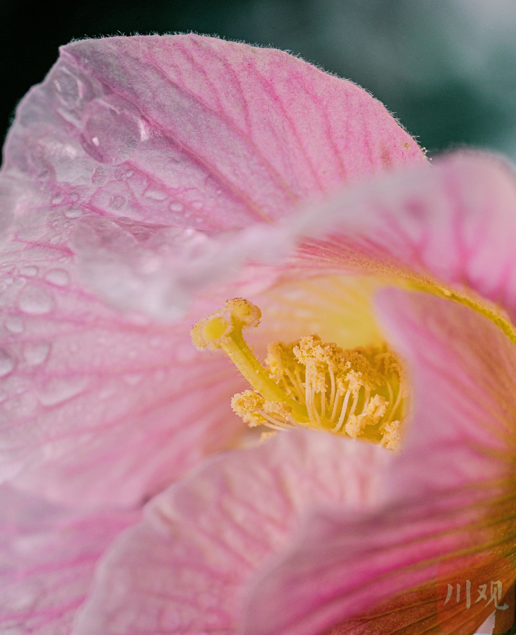 细看雨中芙蓉,更显其独特风韵。花色一日三变,从清晨的素白到黄昏的深红,宛若一场优雅的独舞。这位成都的“老朋友”从不与百花争春,越是寒深露重,越是精神抖擞。雨珠轻缀花瓣,仿佛凝结了千年古城的文脉雅韵。