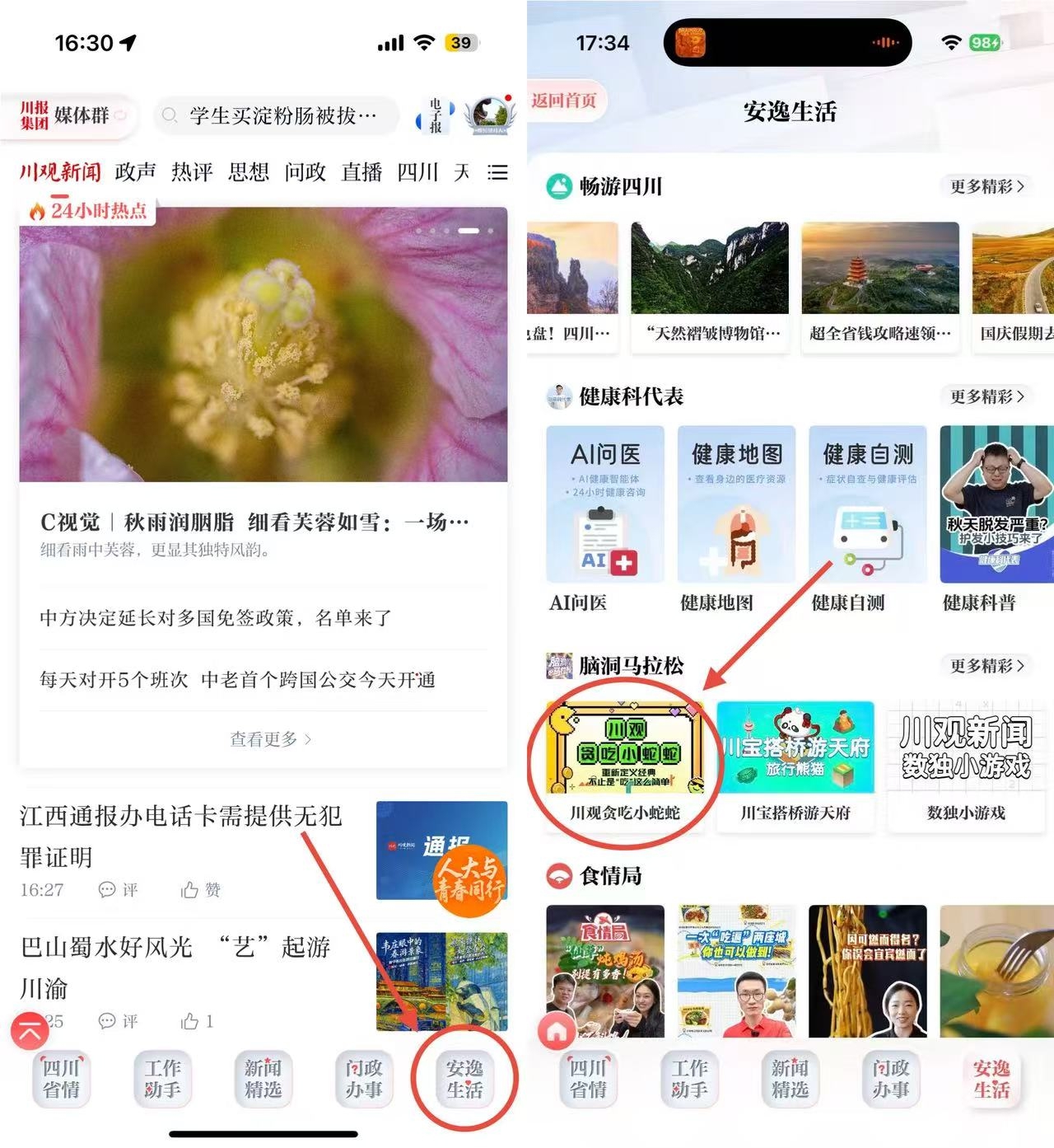 方式二:在川观新闻首页,点击右下方“安逸生活”,找到“川观贪吃小蛇蛇”互动活动图片点击即可参与游戏;