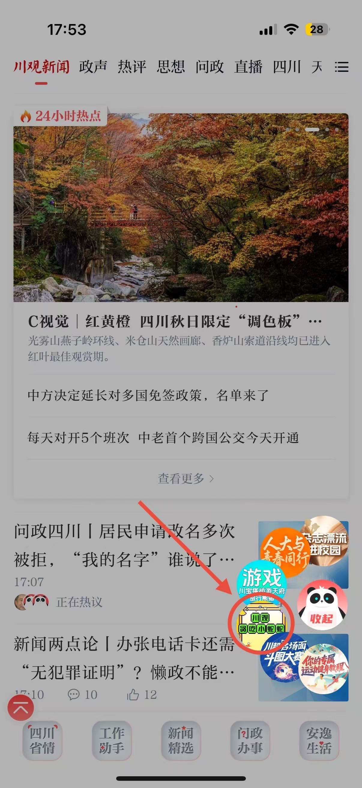 方式三:在川观新闻首页,点击右下方悬浮球,找到“川观贪吃小蛇蛇”互动活动图片点击即可参与游戏;