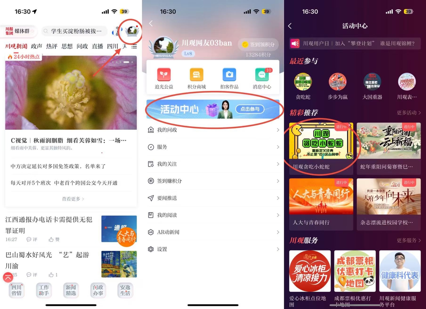 方式四:在川观新闻首页,点击右上角“我的”,进入到“活动中心”,找到“川观贪吃小蛇蛇”互动活动图片即可参与游戏;