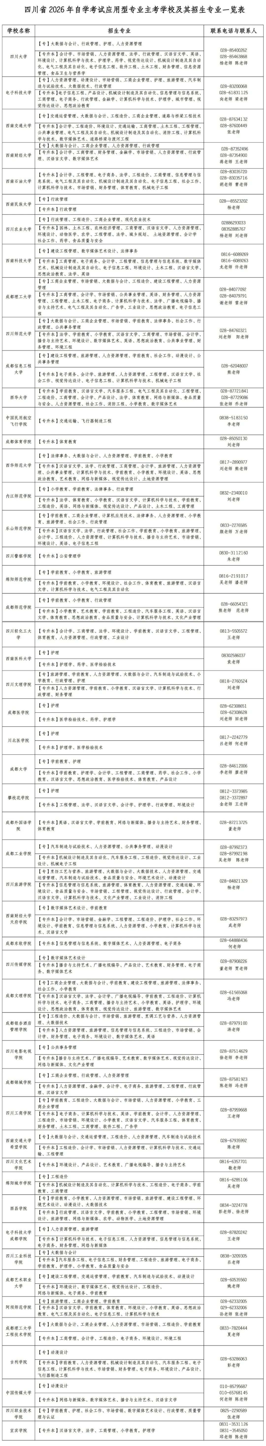 自学考试是我国高等教育的重要组成部分,是个人自学、社会助学和国家考试相结合的高等教育形式。为促进自学考试持续健康发展,省招考委、省教育厅同意四川大学等50所高等学校为我省2026年高等教育自学考试应用型专业的主考学校,并开展自学考试助学工作,现将有关高等学校、主考专业及相关情况通告如下: