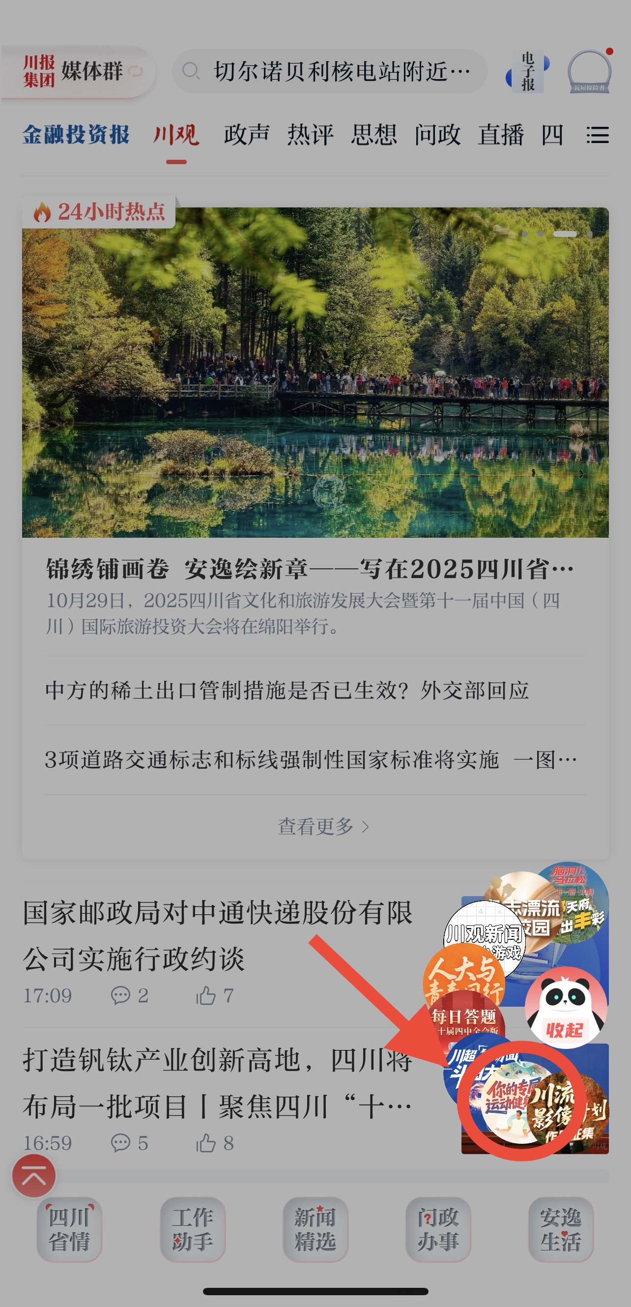 打开川观新闻App,首页右下角悬浮球选择“运动健身课程”按钮,点击即可进入课程。