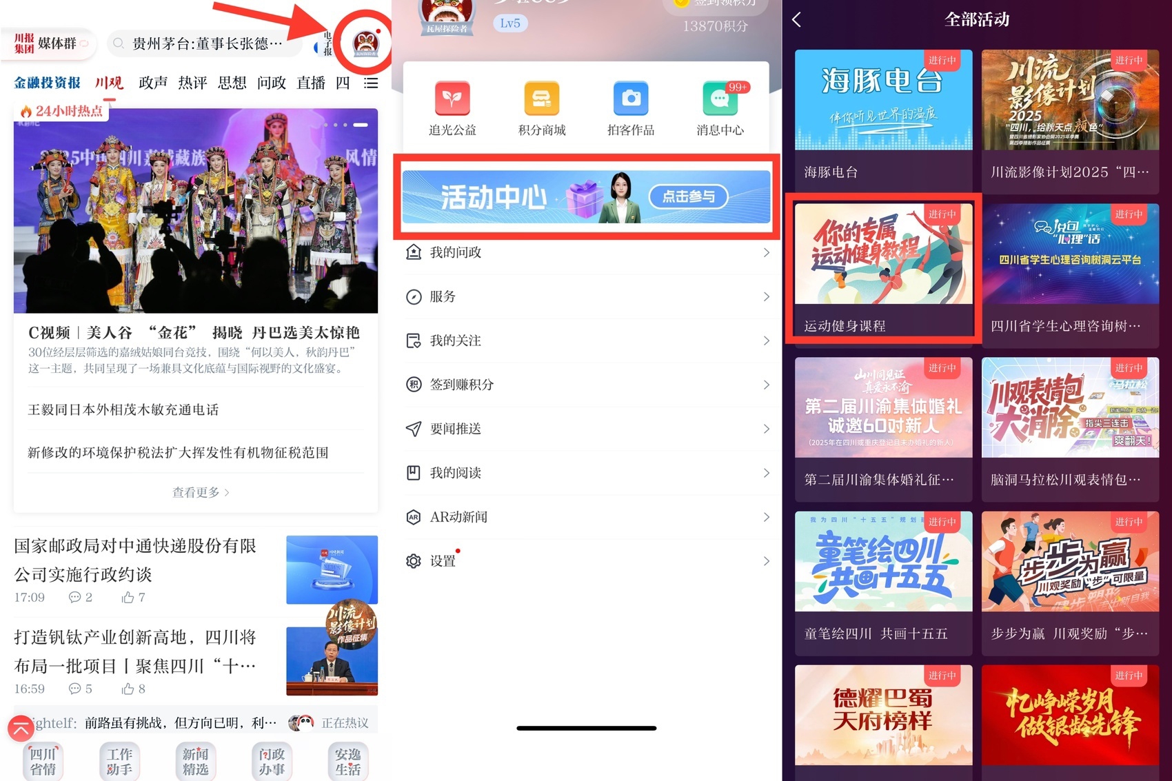 打开川观新闻App,首页右上角点击“我的头像”按钮,选择“活动中心”,进入找到“运动健身课程”,点击即可进入。