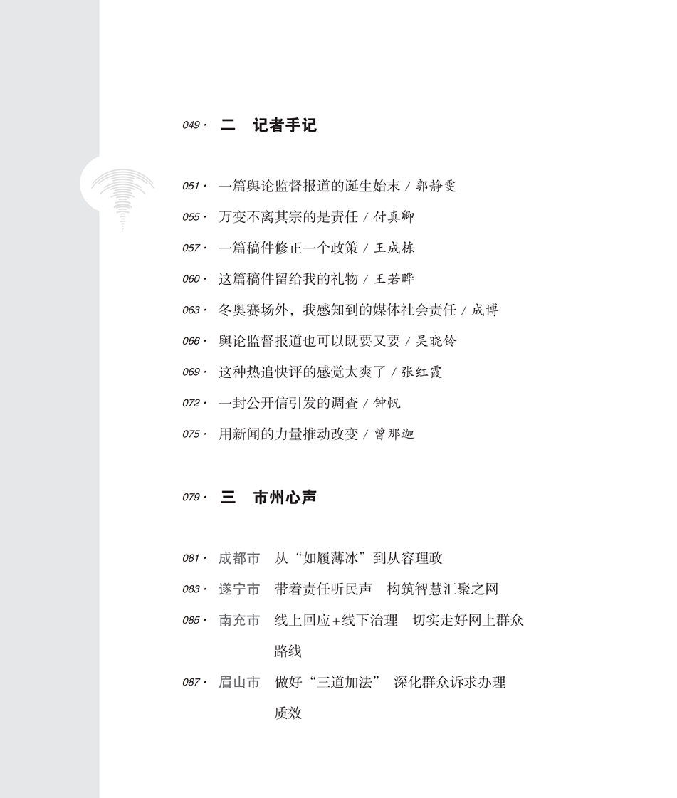 由此,《看见你》聚焦“问政四川”十年经验,联动业界、政界、学界,以案例选编、记者札记、专业解析相结合的方式,探解走好群众路线的协作之道,而不囿于狭义的媒体治理或电子政务。具体而言,全书精选“问政四川”平台上的8个典型案例,涵盖公共安全、市政建设、教育学位等多个民生领域,以及9篇记者手记,10篇省内市州十地网信办、相关机构的参与心得和4篇学术论文,立体呈现了媒体、政府与公众在“问政—理政—共治”过程中的互动与成长。