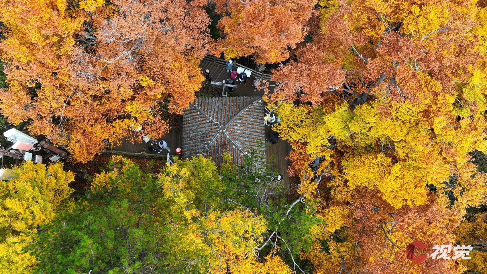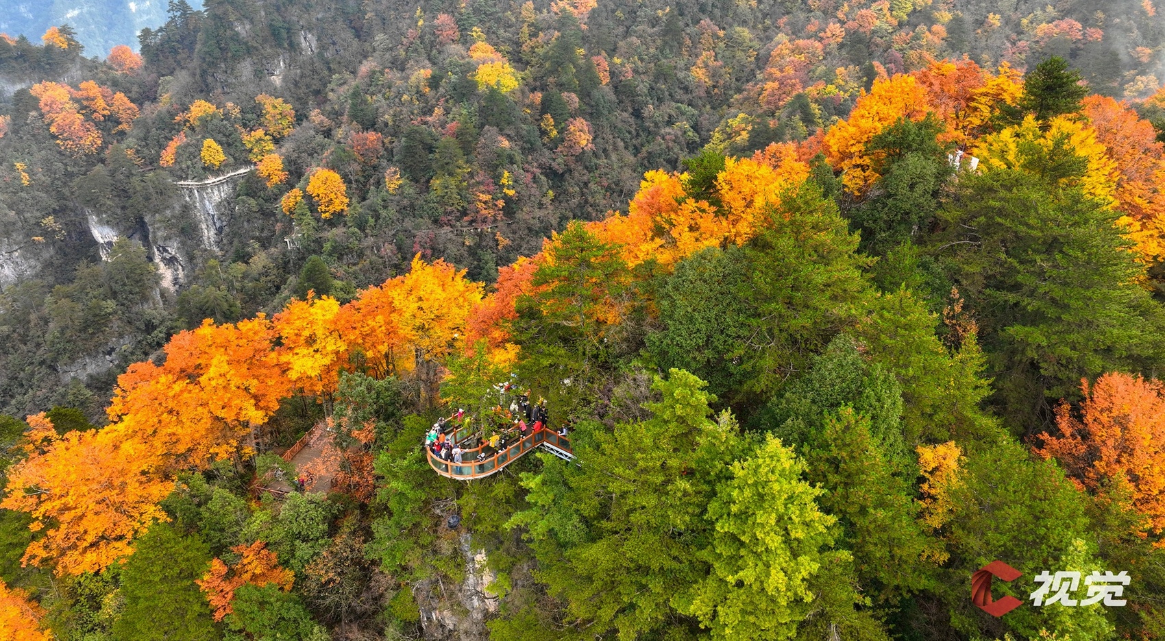11月初,巴中市南江县光雾山燕子岭,游客在观景栈道上欣赏漫山彩林。C视觉签约摄影师 张学金 摄