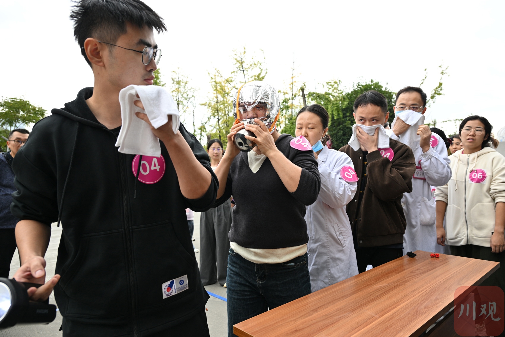 参赛队员佩戴防烟面罩。