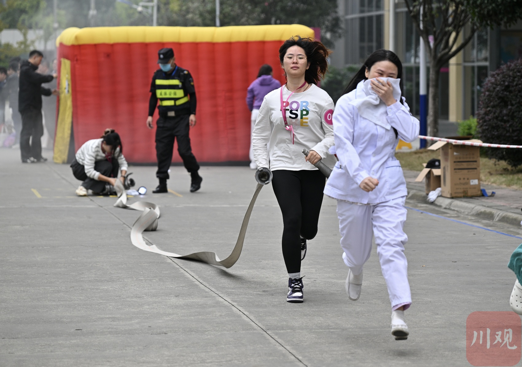 演练以技能竞赛为模式,设置了防烟面罩佩戴、逃生帐篷疏散逃生、消防水带连接、灭火器使用等多个项目,旨在以赛促学、以赛代练,让医护人员在实战化比拼中熟悉消防技能,全力筑牢医院消防安全“防火墙”。赛场上,医护人员动作娴熟、争分夺秒,既展现了扎实的消防技能,也体现了良好的团队协作精神。