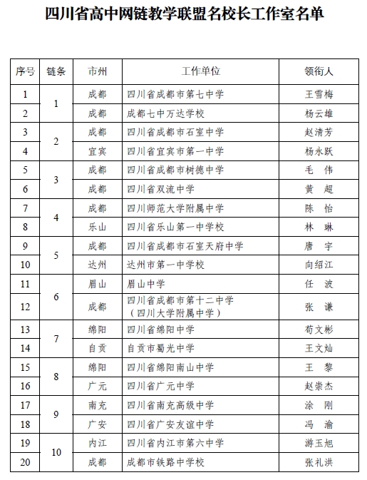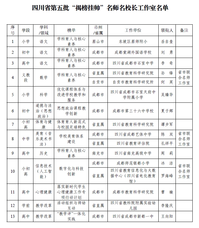 今年9月,经学校自主申报,市(州)教育主管部门、高等学校审核推荐,专家综合评议,省教育厅遴选出了第五批“揭榜挂帅”名师名校长工作室25个、高中网链教学联盟名校长工作室20个。具体名单如下: