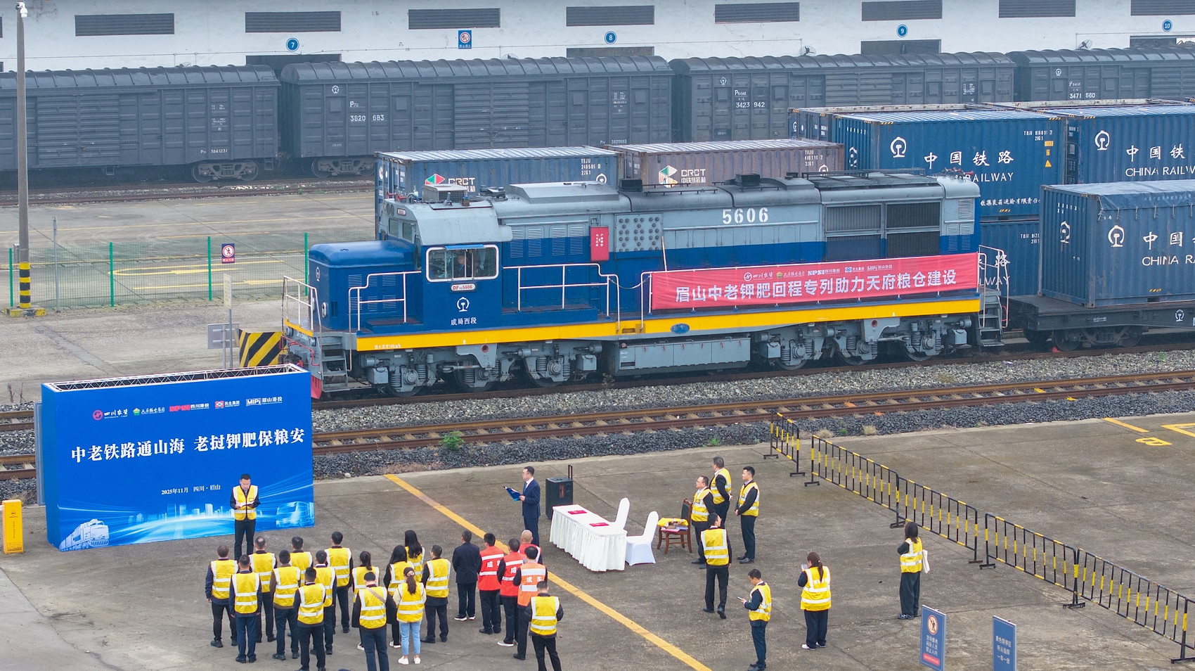 11月7日,在省市联动首列中老铁路进口钾肥保供专列抵眉仪式现场,一列满载3000吨的老挝钾肥保供专列缓缓驶入,标志着“老挝—四川”中老铁路钾肥进口通道正式贯通。这是眉山首列中老铁路进口钾肥保供专列。