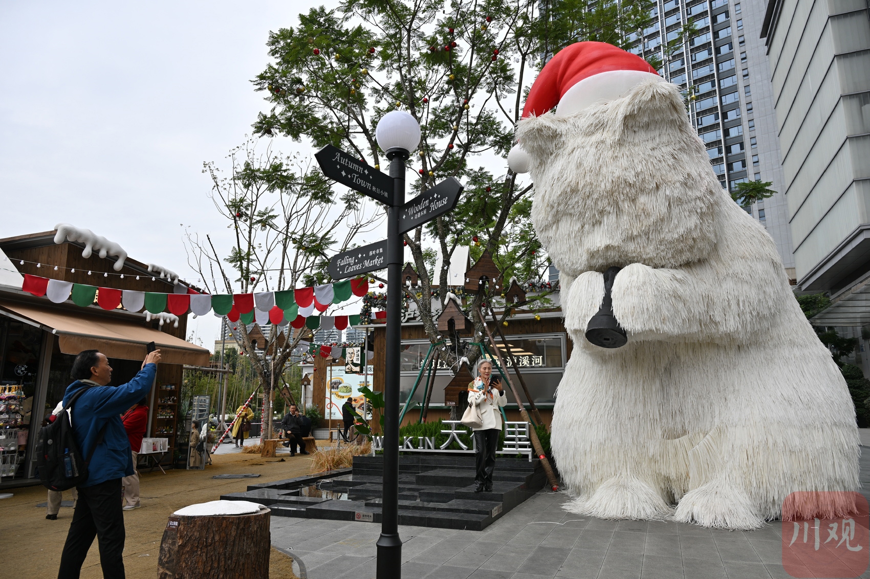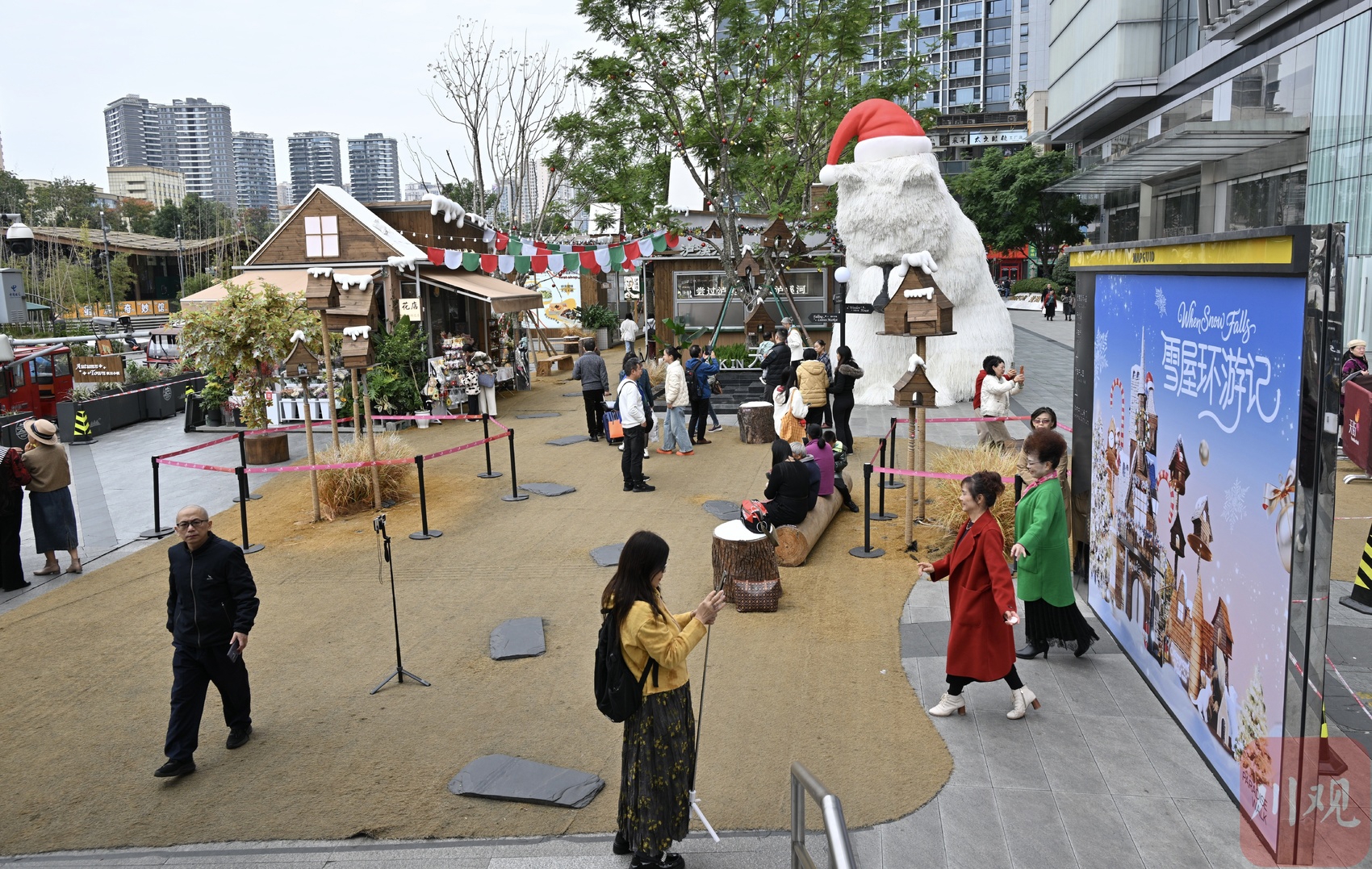 此处主题场景将都市商圈变身浪漫秘境,并免费对外开放。复古木屋错落有致,屋顶微翘、烟囱林立,搭配15米高的梦幻城堡、会发光的树屋墙和憨态可掬的巨型毛绒白熊,仿佛从绘本中走出,让人瞬间穿越进童话世界,为驻足打卡提供了丰富素材。