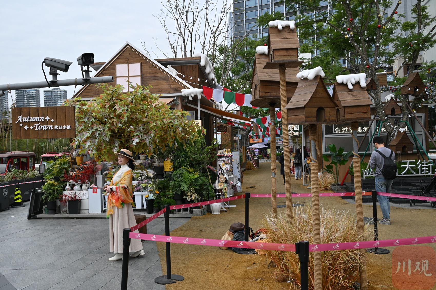 金黄仿真草甸、木制凳子、复古木屋……11月9日,成都地铁7号线茶店子站C口外,一处名为“秋日小镇”的主题场景吸引着众多市民的目光。凭借地铁出站即达的便捷交通和童话般的温暖氛围,这里已成为市民争相打卡的城市新景。
