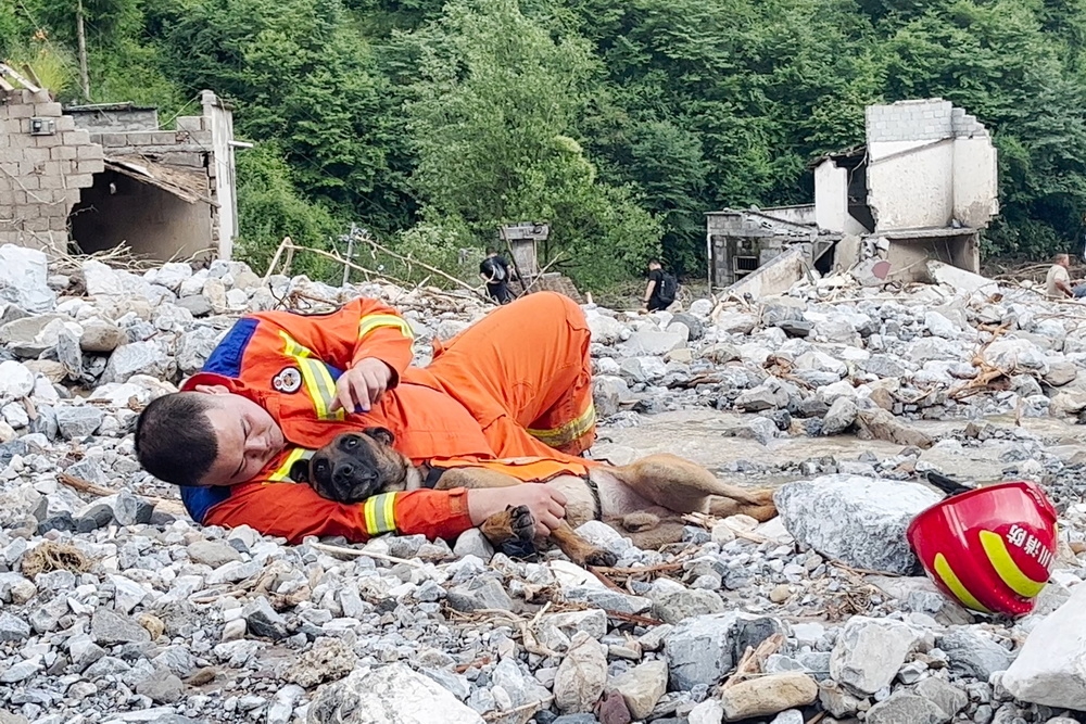 图为训导员王浩在安抚搜救犬“猛男”,在连续高压工作后,强迫其休息保持体力