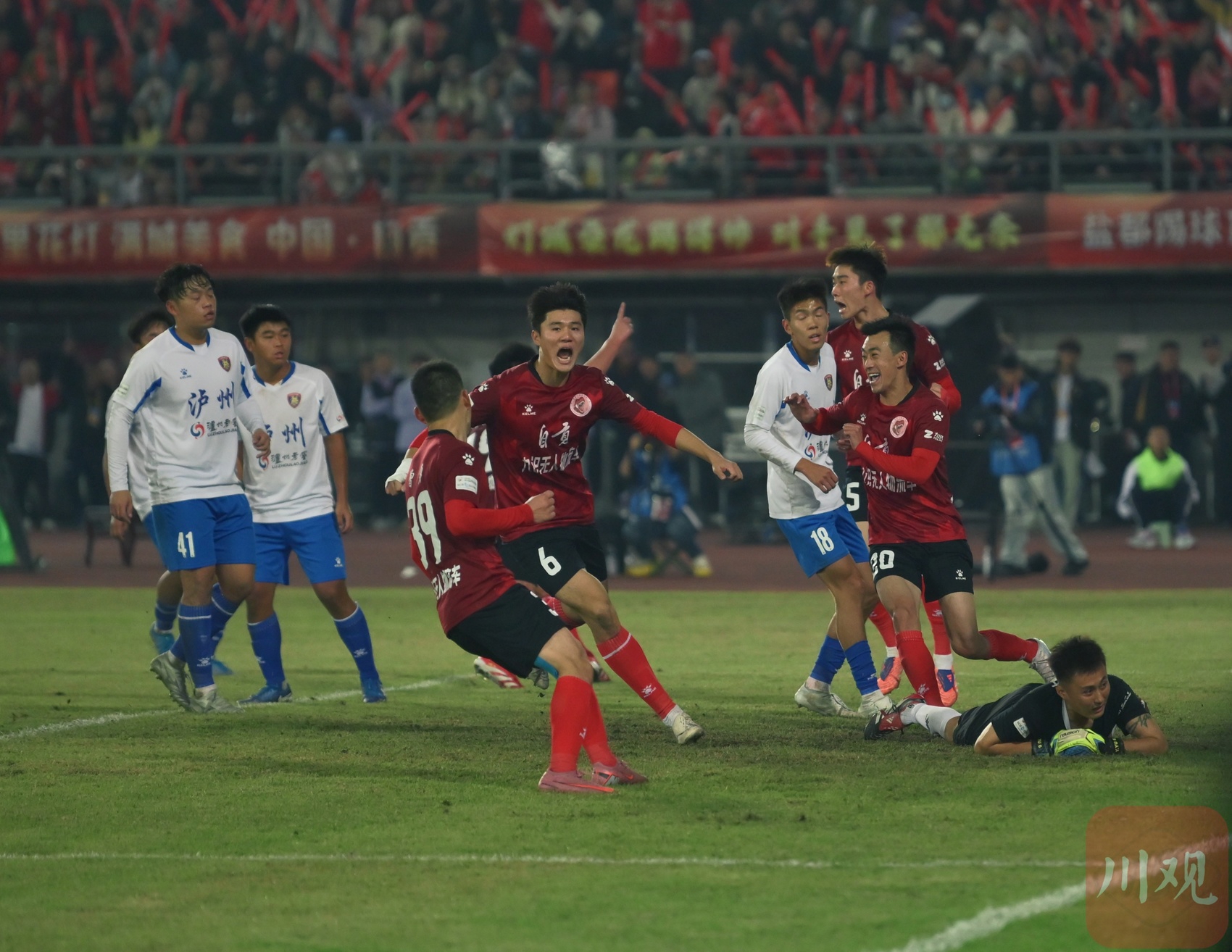自贡灯城燊龙队(红衣)队员进球后欢庆胜利。