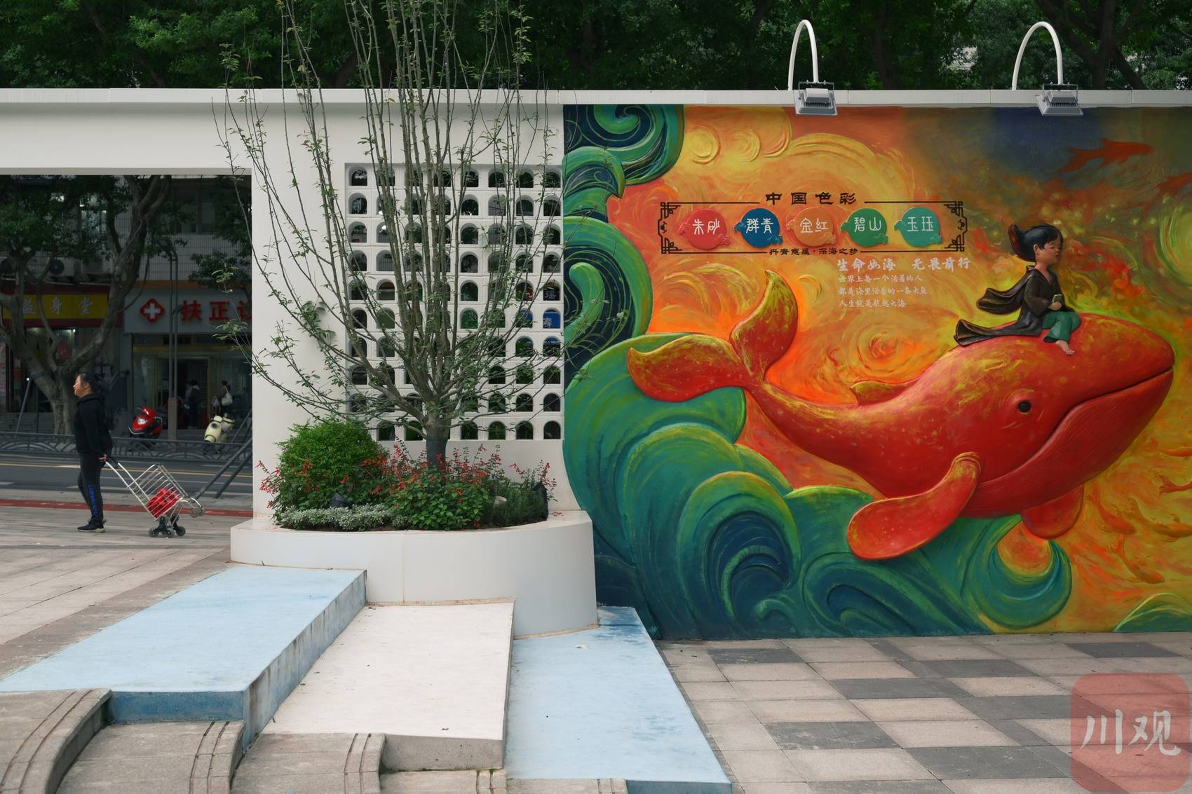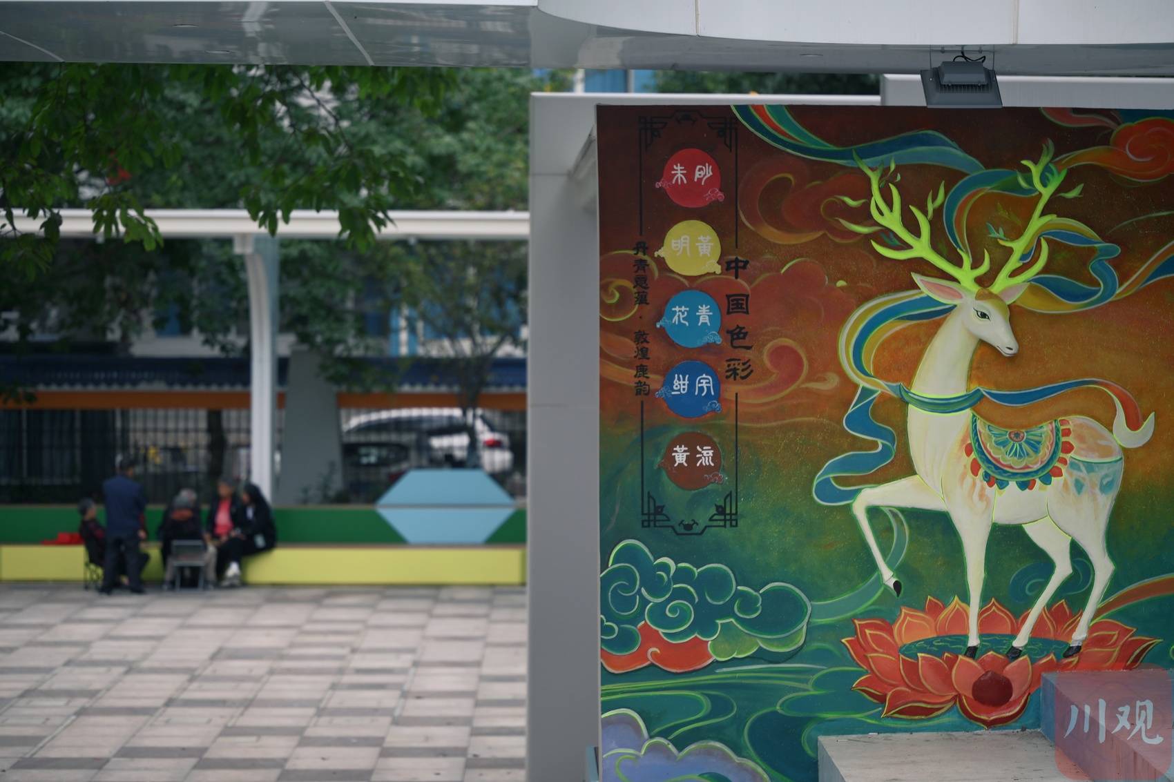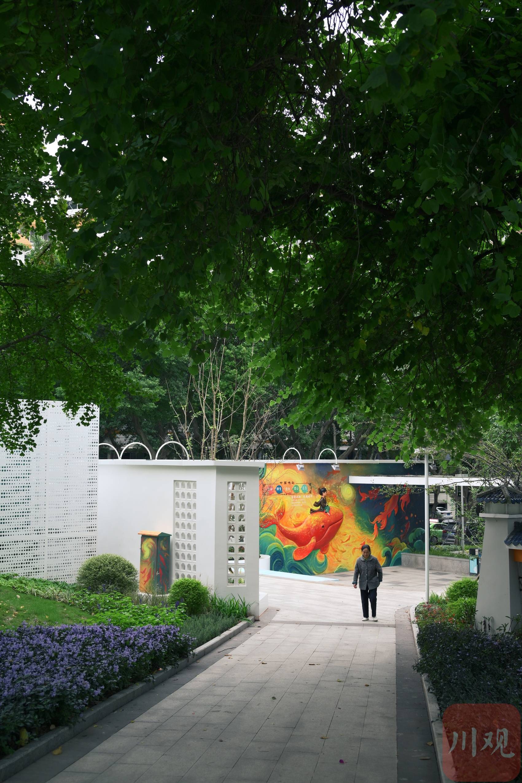 美育花园公园位于自贡市丹桂街道春华路与华园街交叉口,占地面积约1000平方米,在今年9月建成投入使用。作为城市口袋公园,运用色彩与几何美学元素,打造兼具实用价值与艺术特色的城市微空间。口袋公园内墙绘以“美育花园”为主题,精选《长安三万里》《大鱼海棠》《九色鹿》《浪浪山小妖怪》四部具有中华传统文化特色的国漫作品,通过提取作品中的经典角色与场景,形成流动的色彩视觉长卷,既为市民提供户外艺术课堂,又借助作品蕴含的积极向上精神力量,为青少年健康成长营造良好环境。