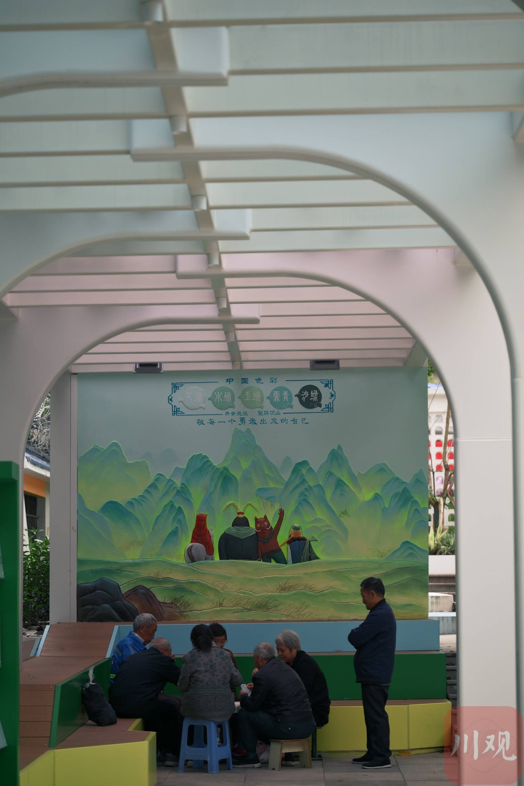 11月10日,自贡市高新区美育花园公园内,市民在国漫墙画下休憩。