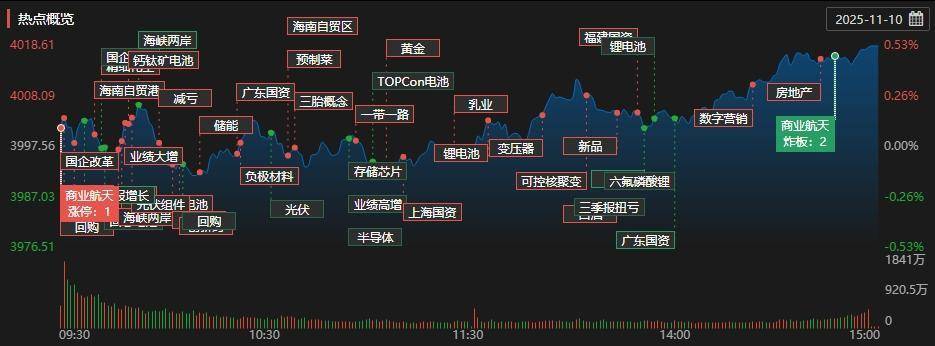 11月10日,A股三大指数涨跌不一。沪指早盘经历震荡后,午后发力突破并站稳4000点整数关口,最终收涨0.53%报4018.60点;深证成指同步微涨0.18%至13427.61点;创业板指跌0.92%,收于3178.83点。量能端释放积极信号,沪深两市成交额升至21745亿元,较前一日增加1754亿元,资金进场痕迹明显。从盘面看,板块“涨多跌少”,个股活跃度提升,3300余只股票实现上涨,近百股封死涨停,市场赚钱效应较此前改善。