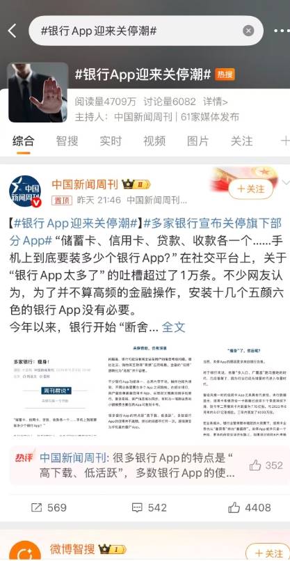 11月10日,“银行App迎来关停潮”进入热搜引发网友热烈讨论,该词条在微博阅读量突破了4000万。