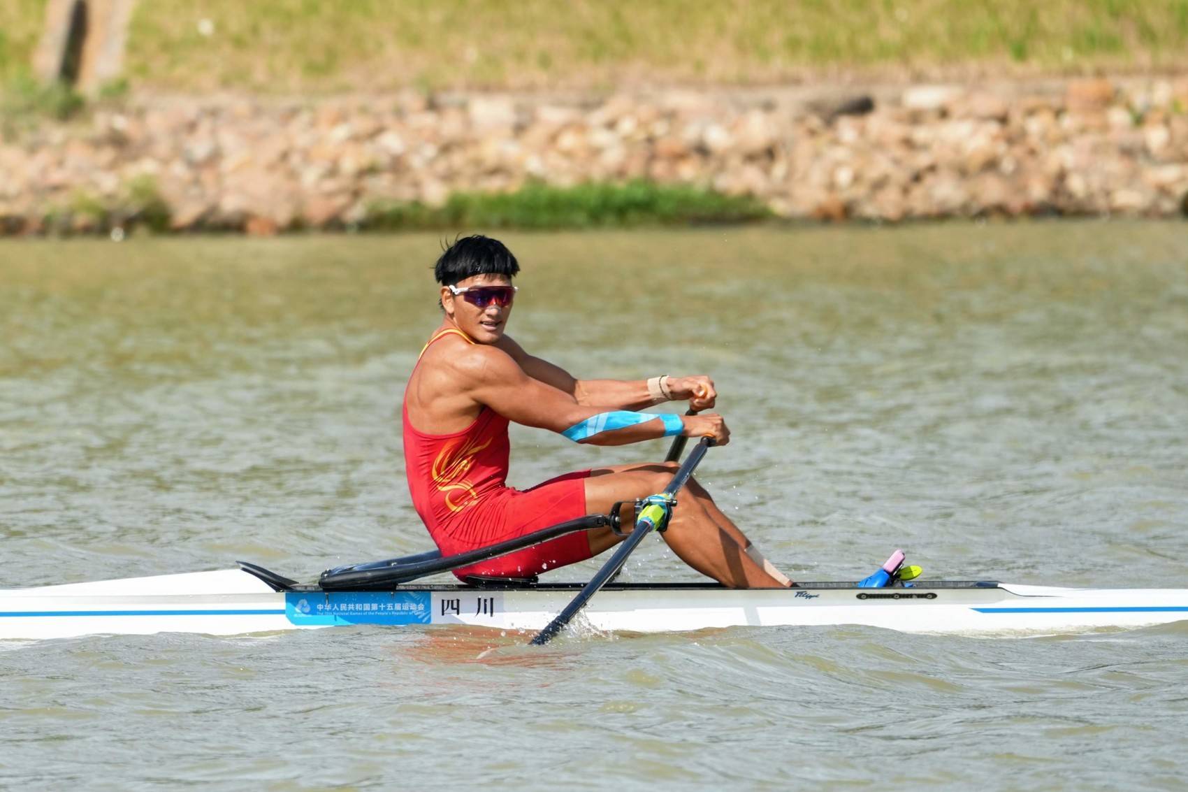 11月10日上午,第十五届全国运动会男子单人双桨决赛在广东国际划船中心展开。来自甘孜的“00后”选手邓志玮,以4分59秒17的成绩夺得金牌。