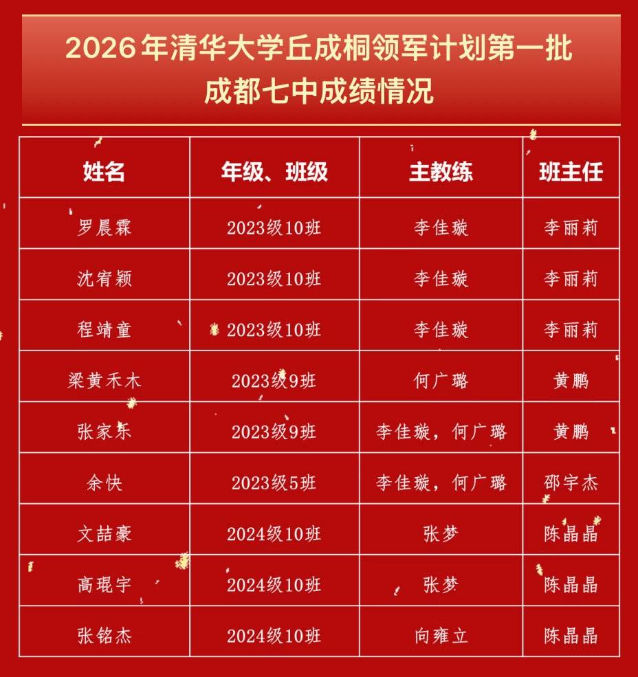 11月11日,记者从成都七中获悉,清华大学丘成桐数学科学领军人才培养计划2026年第一批通过选拔的认定名单日前出炉。成都七中9名学子入选,位居全国第一。