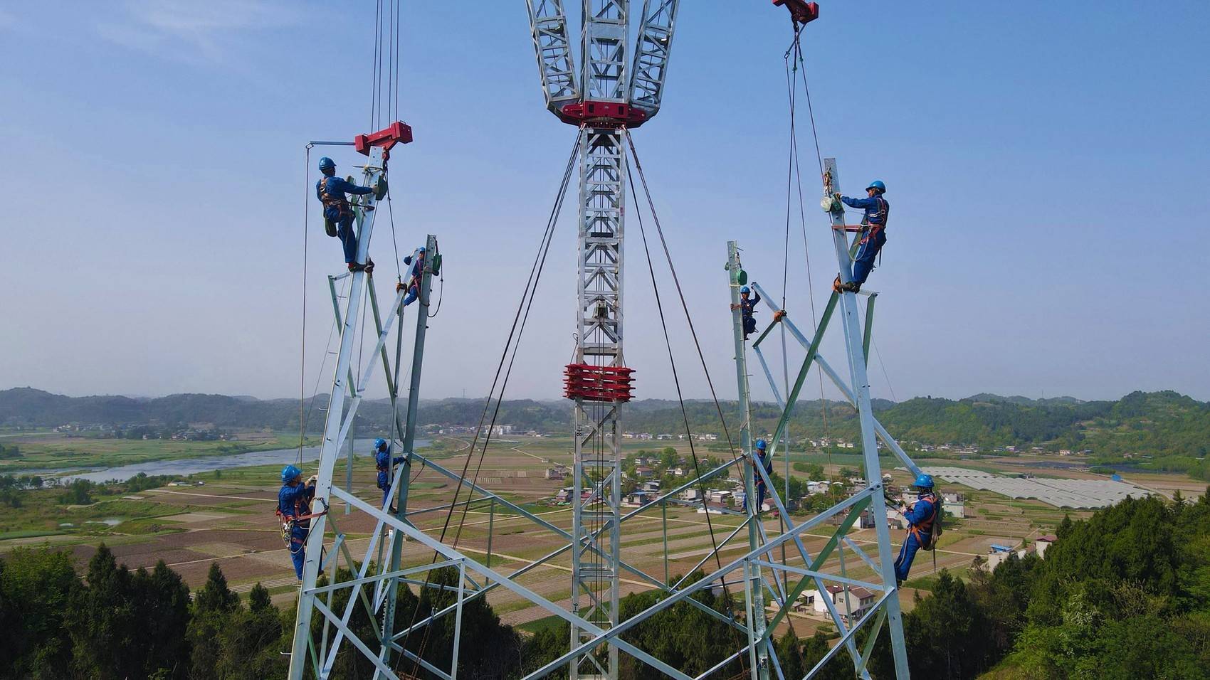 变电站所在区域内电网、高铁、高速路网交织,为完成10条500千伏输电线路的跨越施工,国网成都供电公司、国网四川建设公司与铁路、高速等部门紧密协作,引入机械化封网、可视化放线等新技术,并首次在全省应用重载无人机进行跨越施工,最终通过反复模拟演练、优化关键工序,如期实现输电线路贯通。