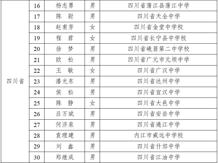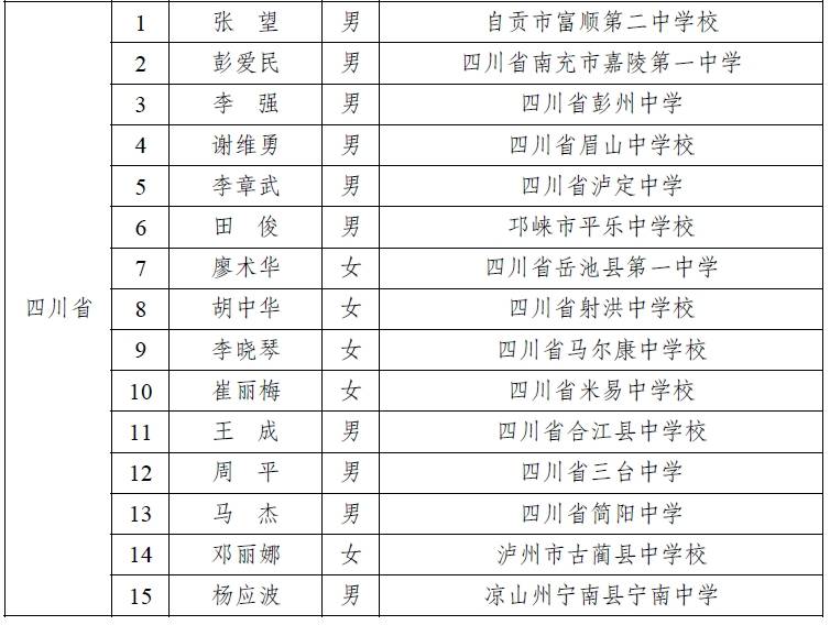 经学校自主申报、省级教育行政部门审核公示、等额推荐、会议评议,教育部确定了首批全国县域普通高中头雁教师岗位计划入选教师600人并公布了名单,其中四川省共有30名教师上榜,具体名单如下: