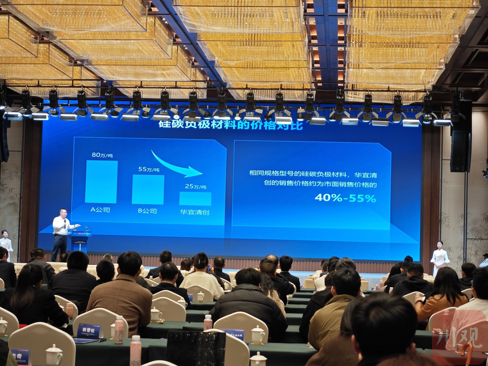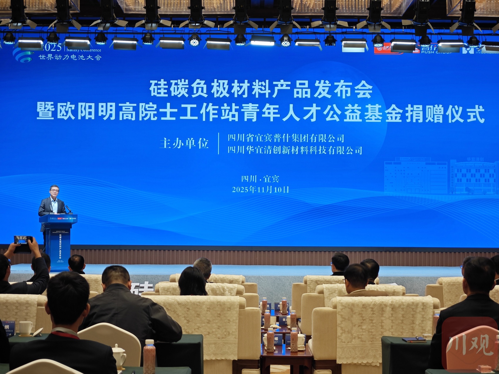 一款在成本、能耗上具备“绝对优势”的固态电池关键材料在宜宾诞生。11月10日下午,在普什集团&华宜清创硅碳负极材料产品发布会暨欧阳明高院士工作站青年人才公益基金捐赠仪式上,四川华宜清创新材料科技有限公司(以下简称“华宜清创”)董事长杨敏发布了三款全固态电池用硅碳负极材料产品,其销售价格仅为市面上相同规格型号产品的40%至55%。