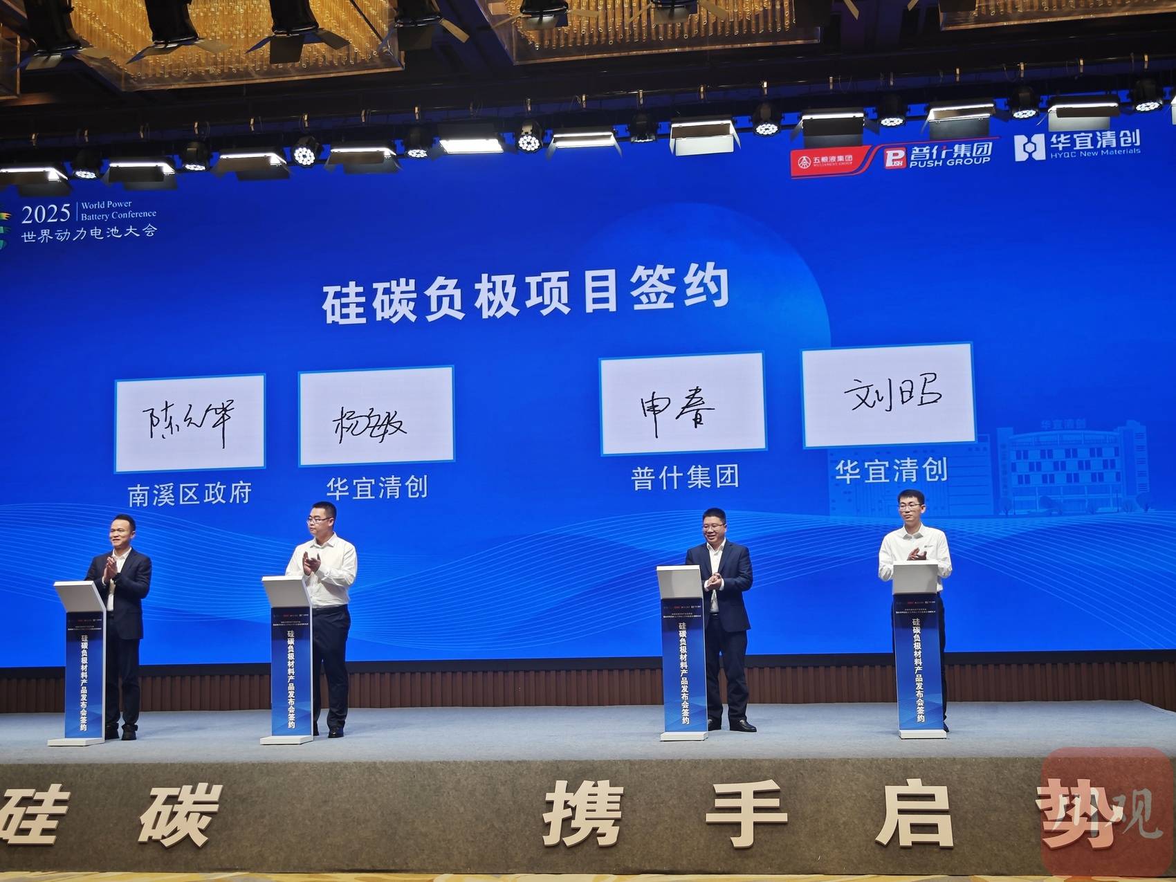 作为“2025年世界动力电池大会”系列重要活动之一,本次活动举行了硅碳负极项目签约仪式和战略合作签约仪式,华宜清创分别与宜宾市南溪区、普什集团进行了硅碳负极项目签约,与超威电源集团有限公司、广州融捷能源科技有限公司进行了战略合作签约。