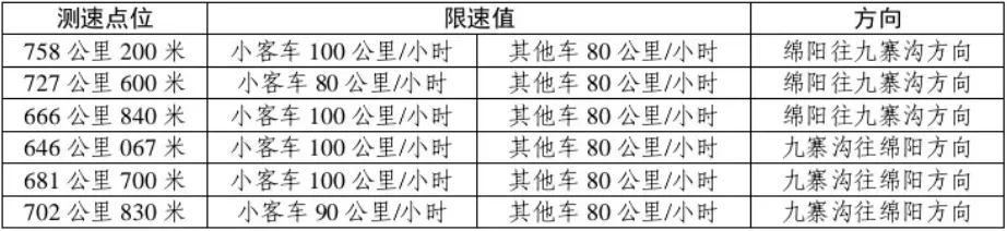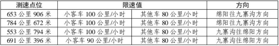 共设置4处测速点,小客车限速分为90公里/小时、100公里/小时,其他车辆统一限速80公里/小时: