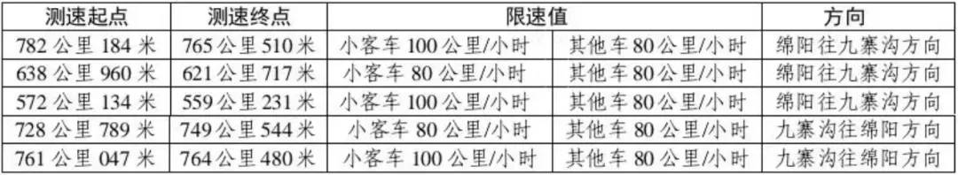 共设置6处测速点,小客车限速分为80公里/小时、90公里/小时、100公里/小时,其他车辆统一限速80公里/小时:
