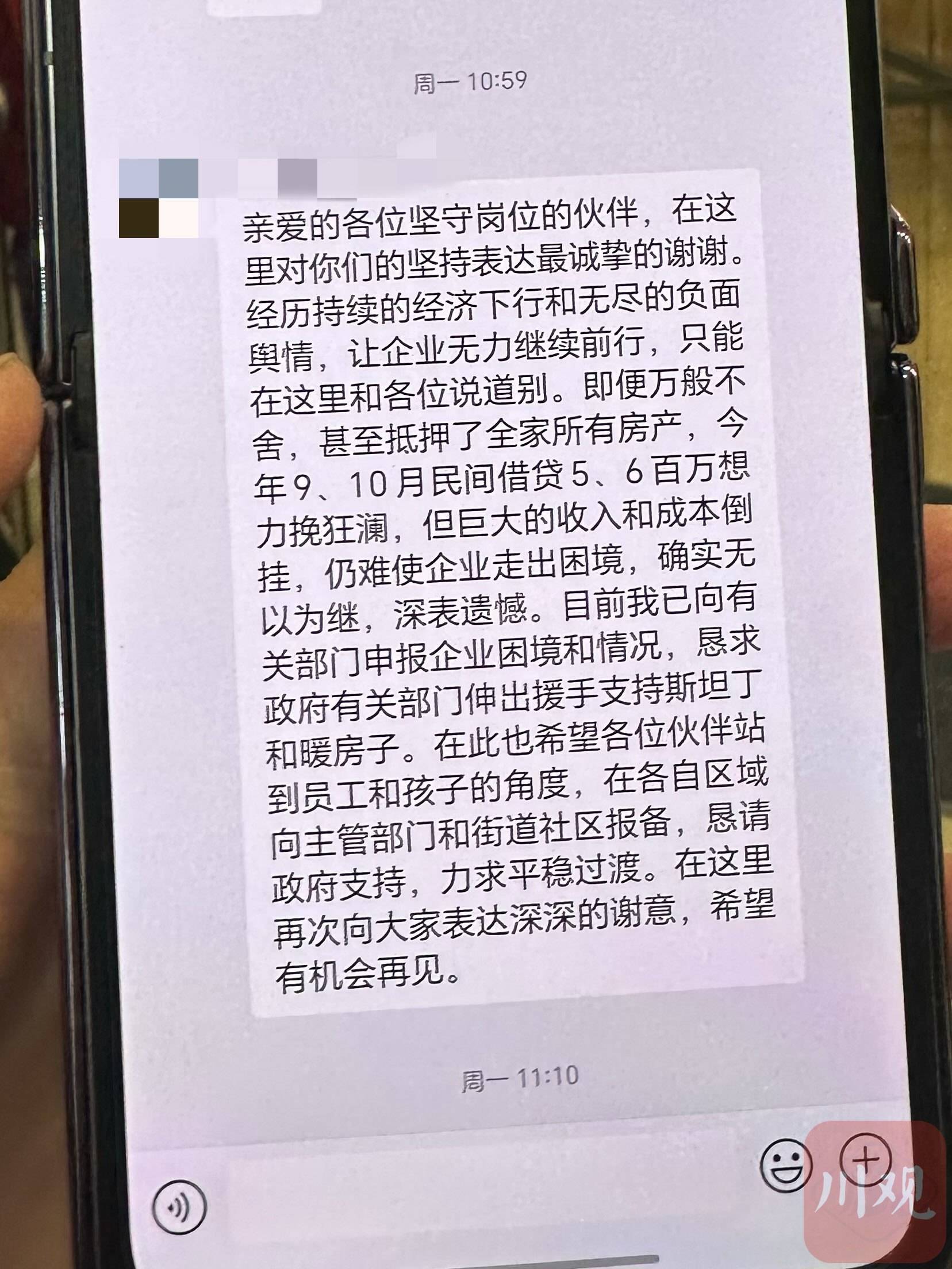 她翻开手机工作群,周一上午公司负责人在群里发布了一条“道别信息”,称“企业无力继续前行,只能在这里和各位说道别”,随后便失去联系。