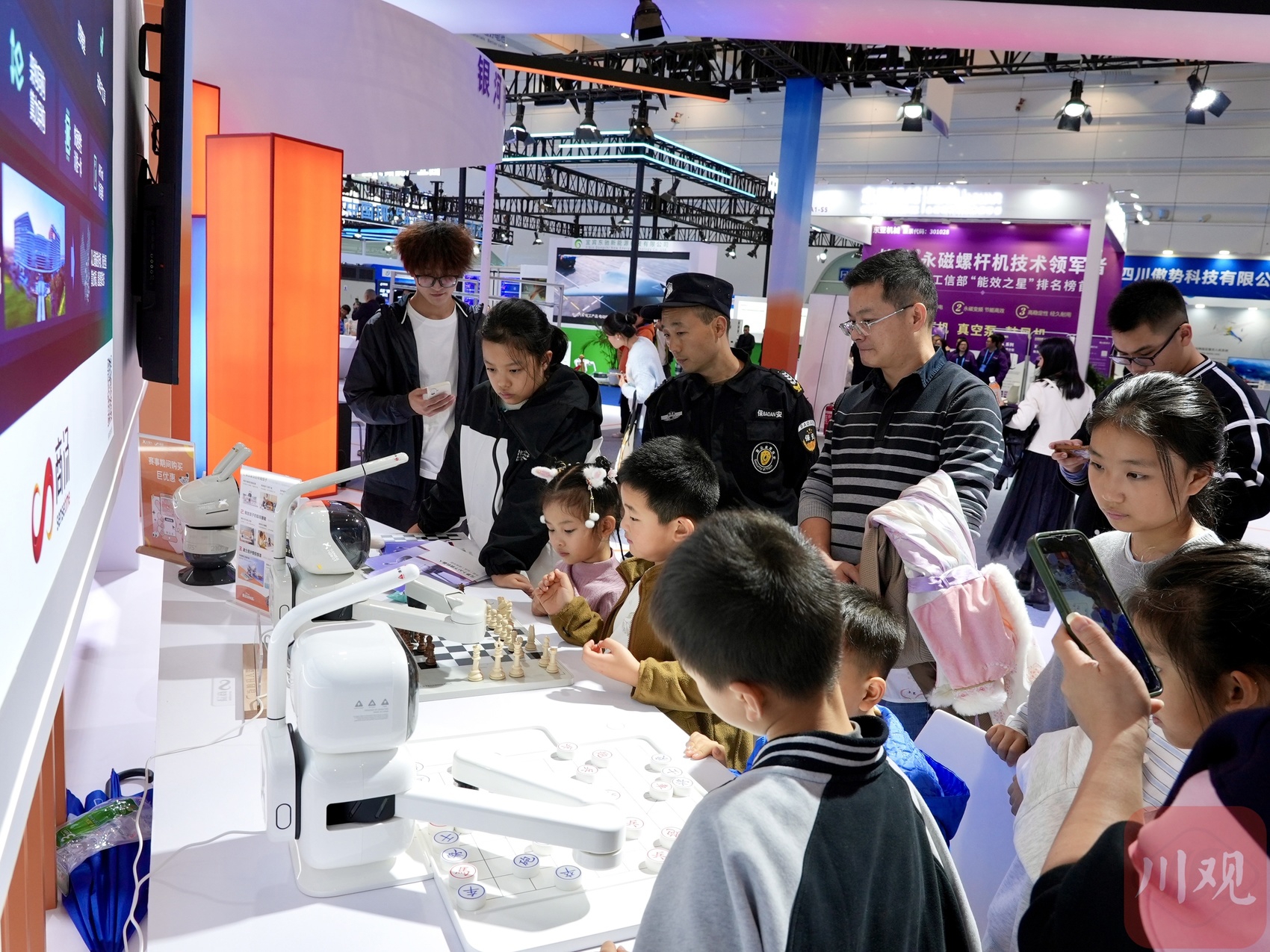 小朋友与下棋机器人下棋。