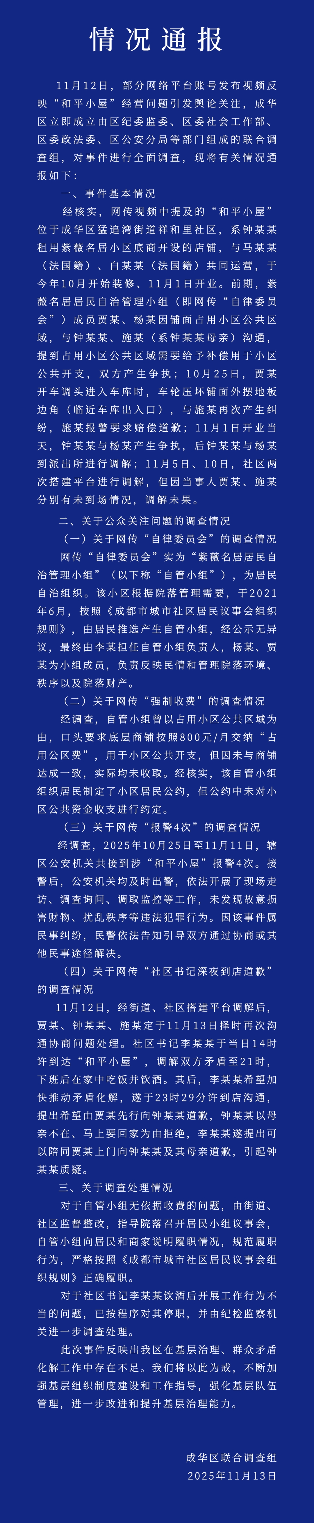 11月12日,部分网络平台账号发布视频反映“和平小屋”经营问题引发舆论关注。11月13日,成都市成华区联合调查组发布情况通报: