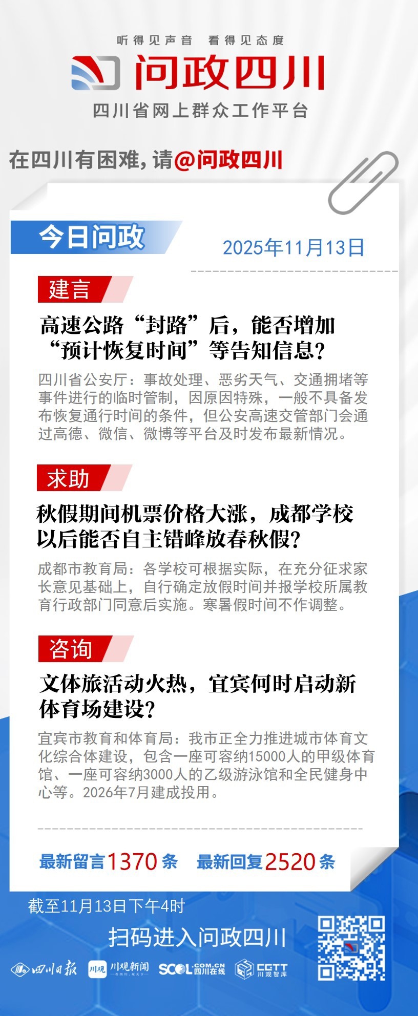 问政四川网友提问:当前高速公路的封路通告,常常只告知“封路”,却不说明原因和预计恢复时间,给大家出行带来了不便。建议通告增加这些关键信息。