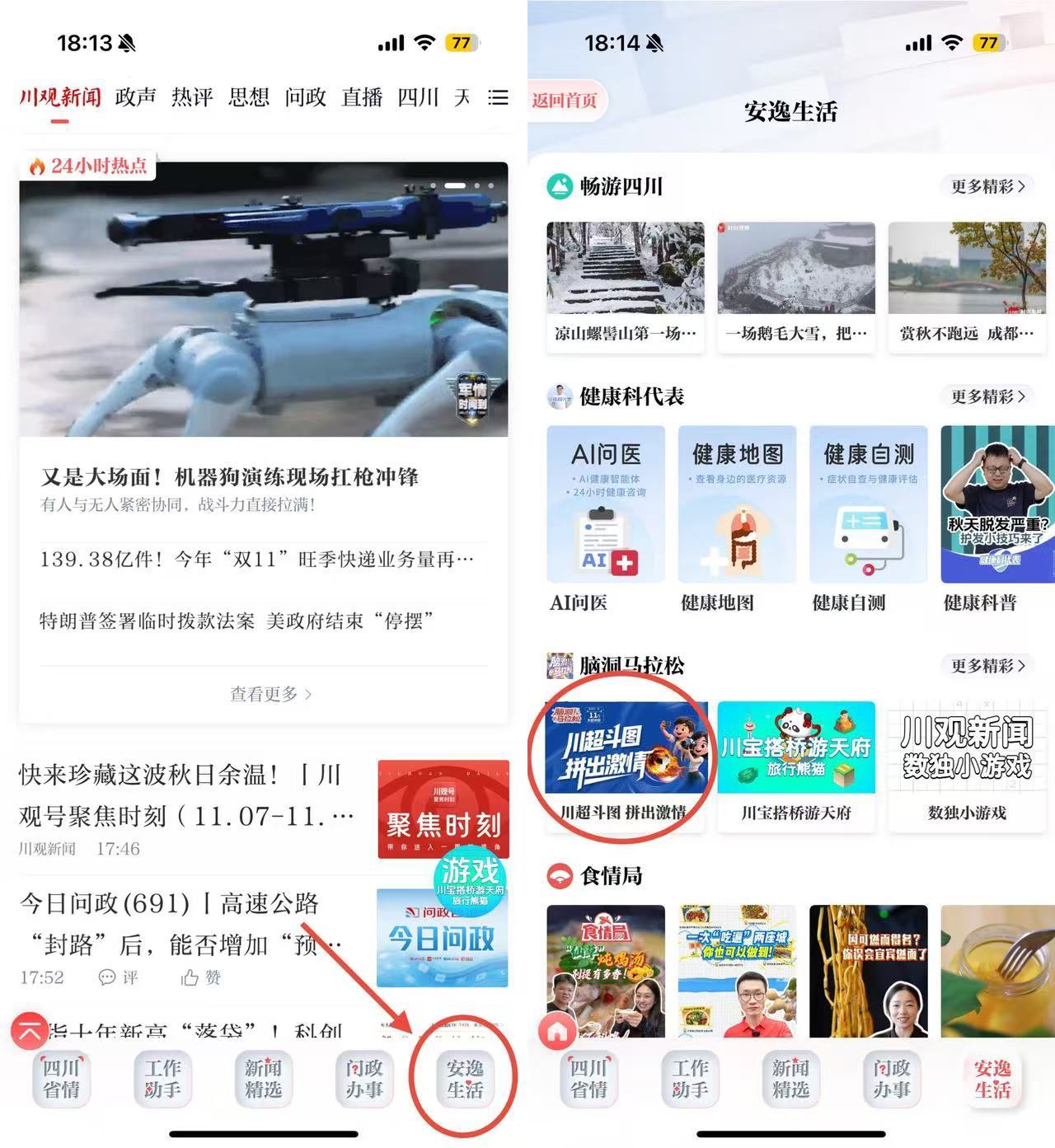 方式二:在川观新闻首页,点击右下角安逸生活,在脑洞马拉松找到“川超拼图”,点击即可参与: