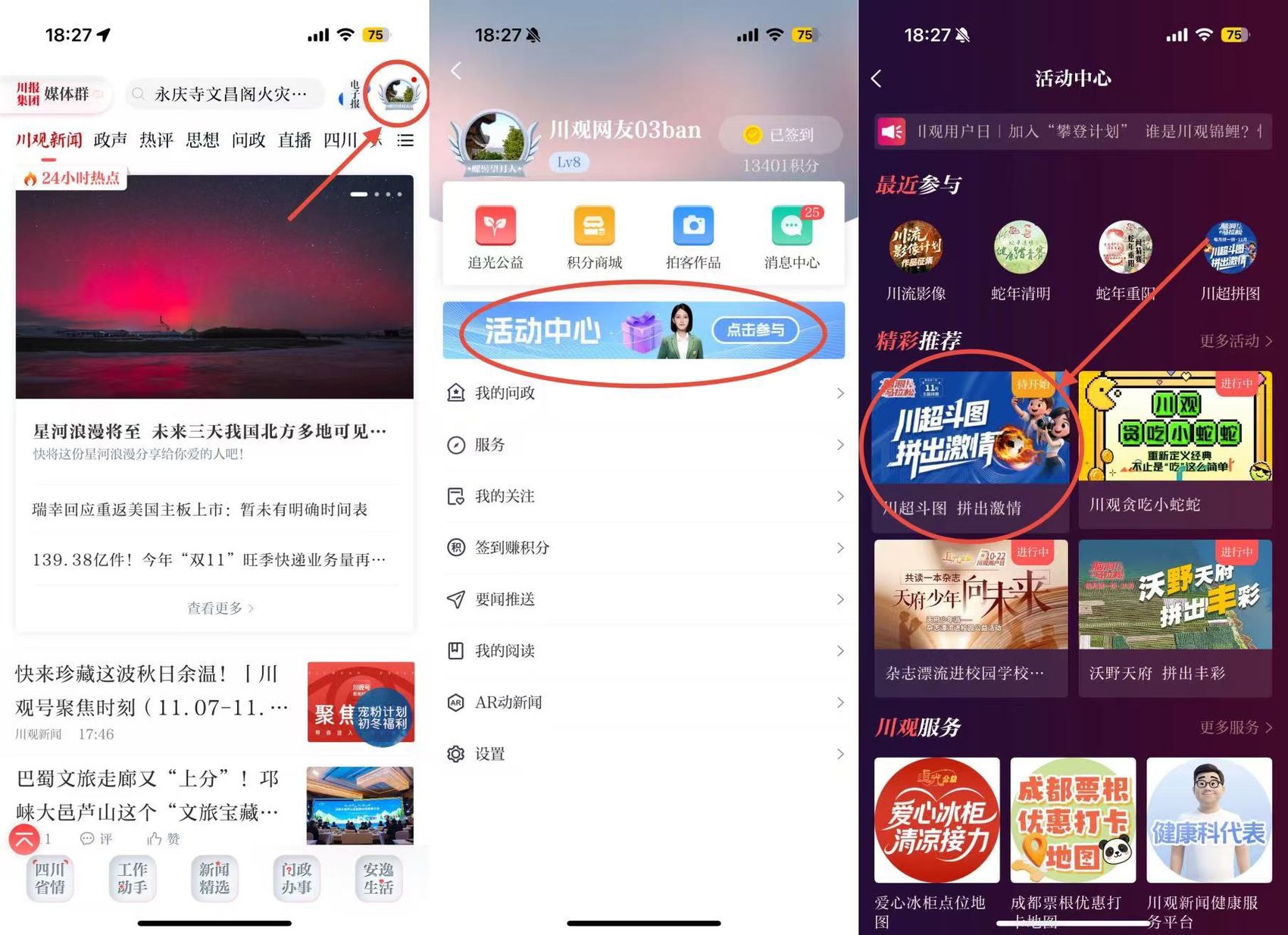 方式三:在川观新闻首页,点击右上角“我的”,再点击“活动中心”,找到“川超拼图”活动图片,点击即可参与;