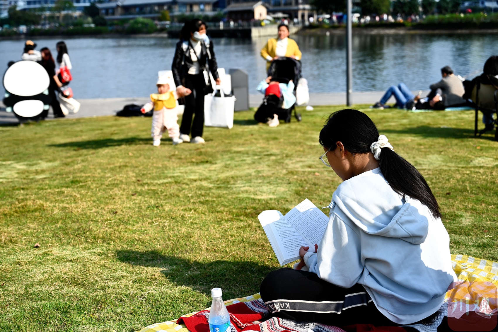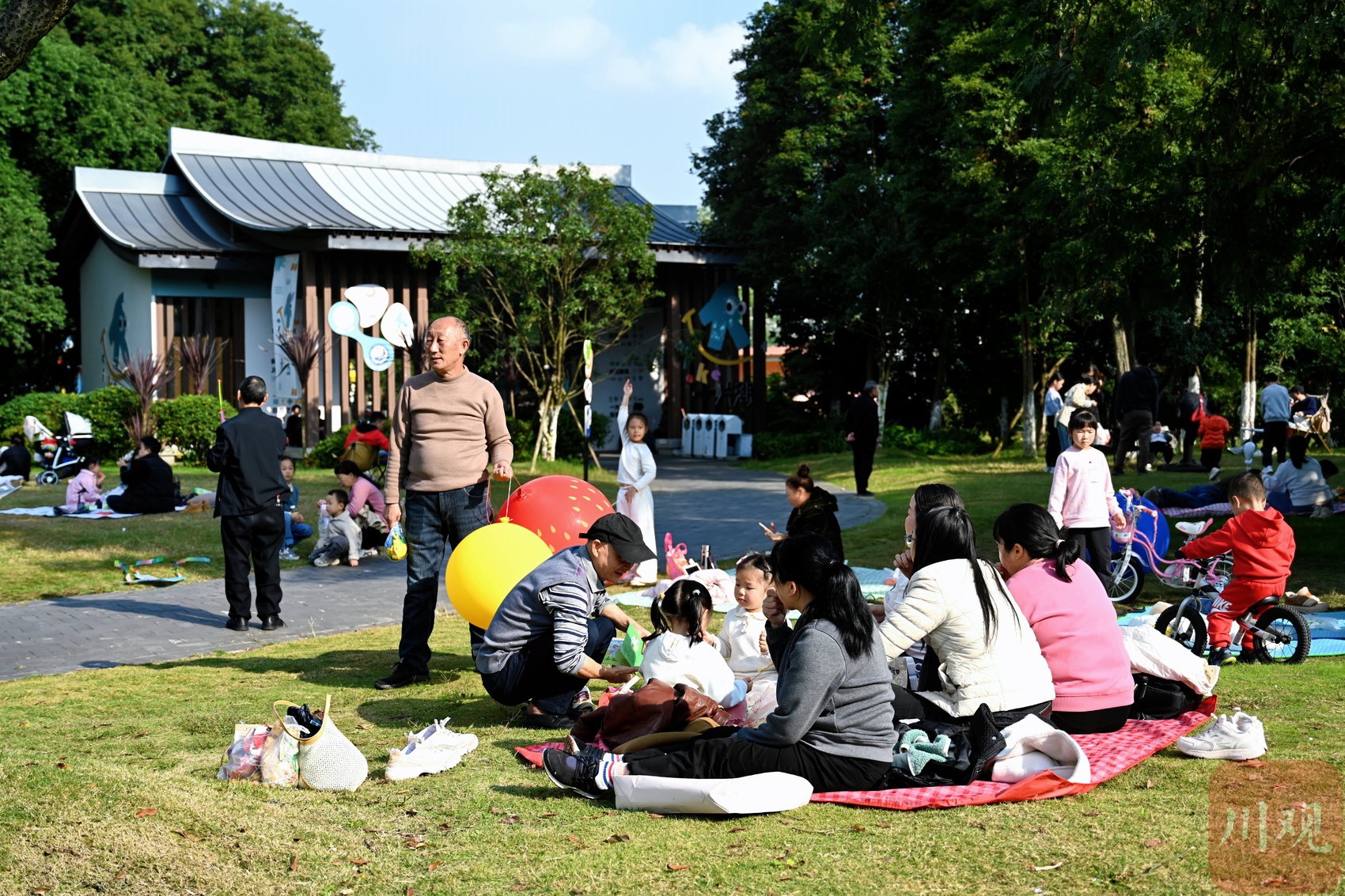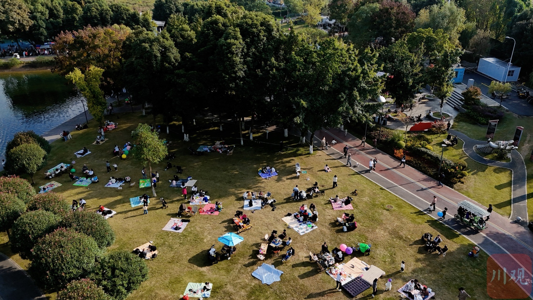 11月15日,成都天空放晴,阳光温暖明媚,气温攀升到了20°C。悠闲的周末时光,市民纷纷走出家门晒太阳,享受难得的“日光浴”。在北湖生态公园的草坪上,大家席地而坐,开启露营模式,洋溢着轻松与欢乐的氛围。