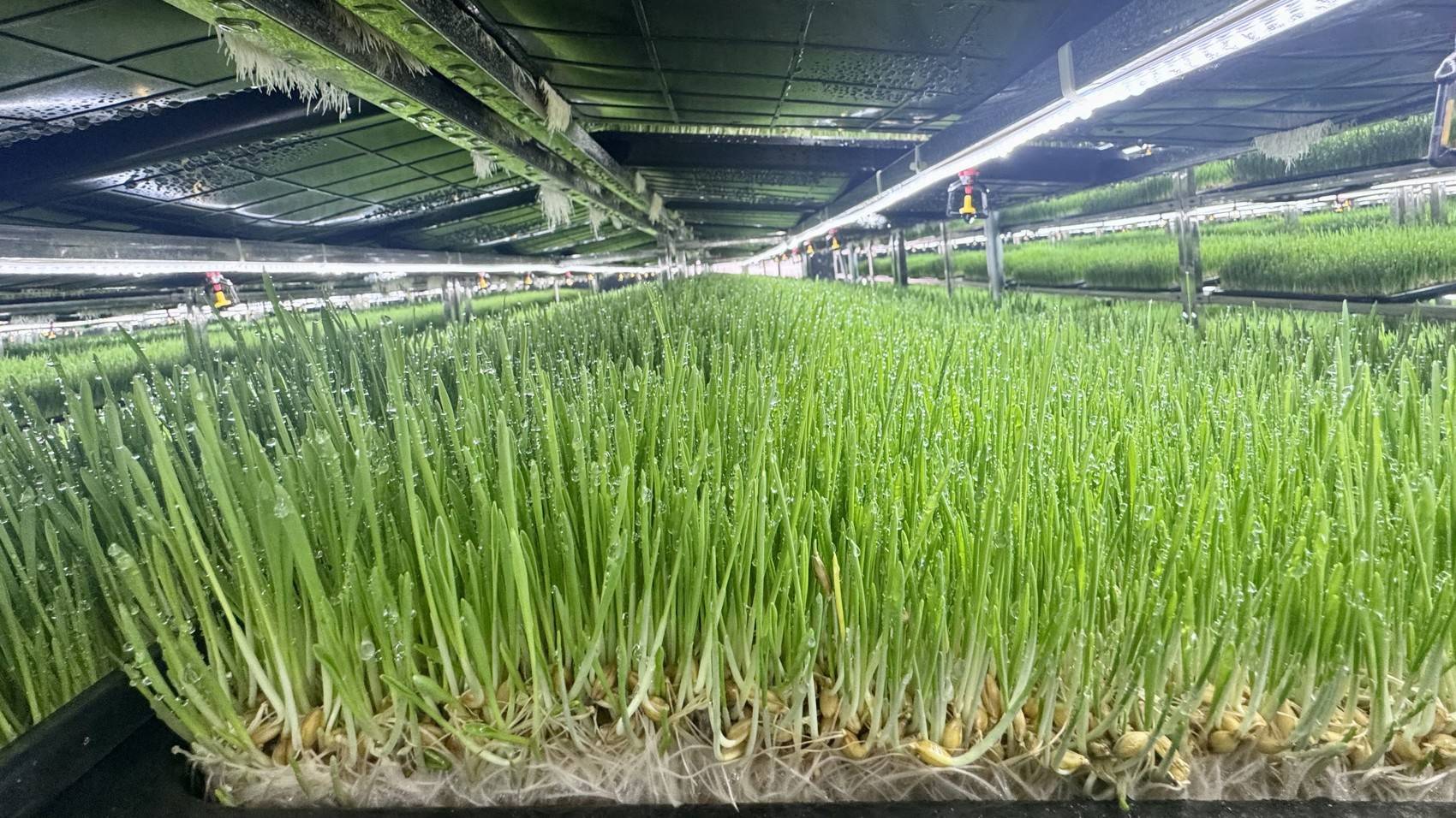 “水培牧草的生长周期是7天,大棚日均产出5吨鲜草,相当于种了300亩地的传统牧草,可供800余头肉牛食用。”该公司负责人郭维玮介绍,水培牧草能量转换率可达90%,蛋白质含量也比青贮饲料高18%左右,可以一定程度上缓解当地饲草短缺的困境。