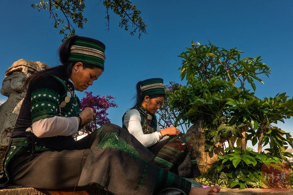 2021年5月10日,云南红河建水小桂湖畔,两位妇女静做手工。