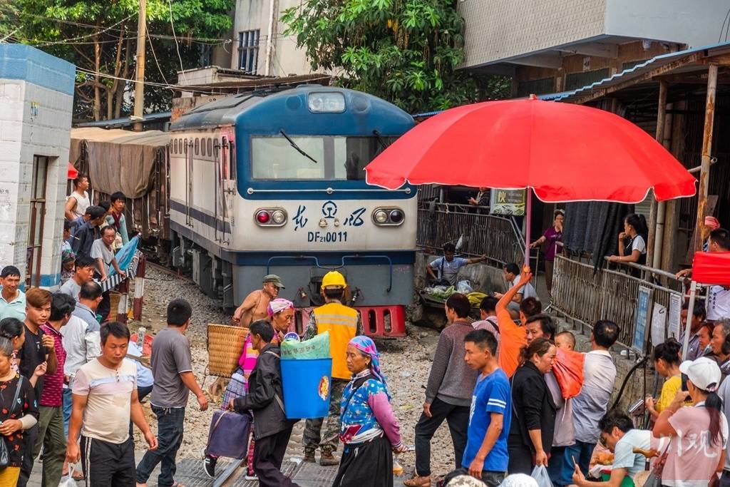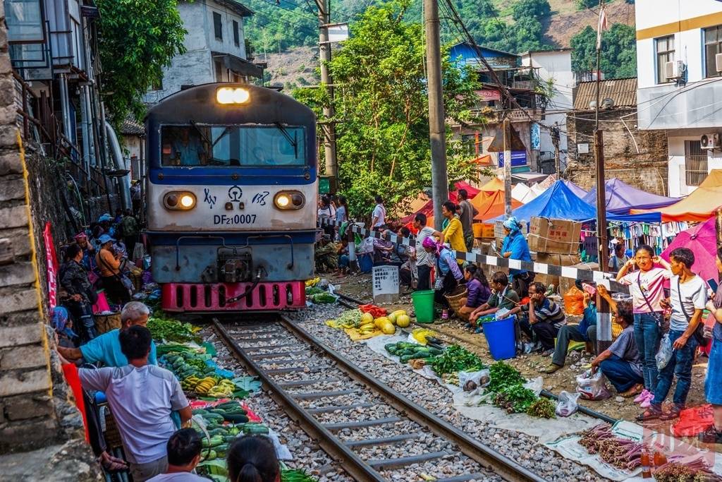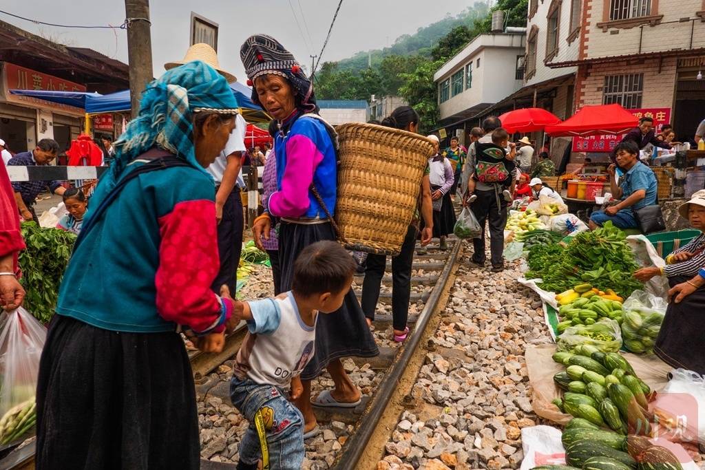 2021年5月10日,云南屏边县,滇越铁路最后的火车集市,每周一次赶集日,村民于铁路两侧农贸交易。