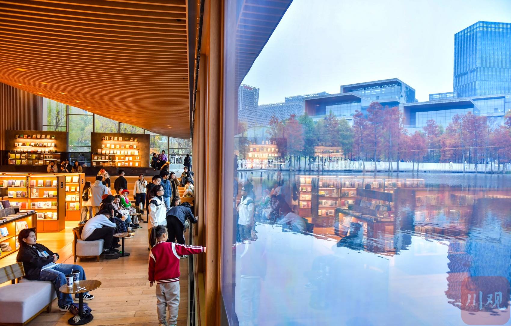 位于四川天府新区成都科学城的兴隆湖畔,市民在“水下书店”看书休闲。