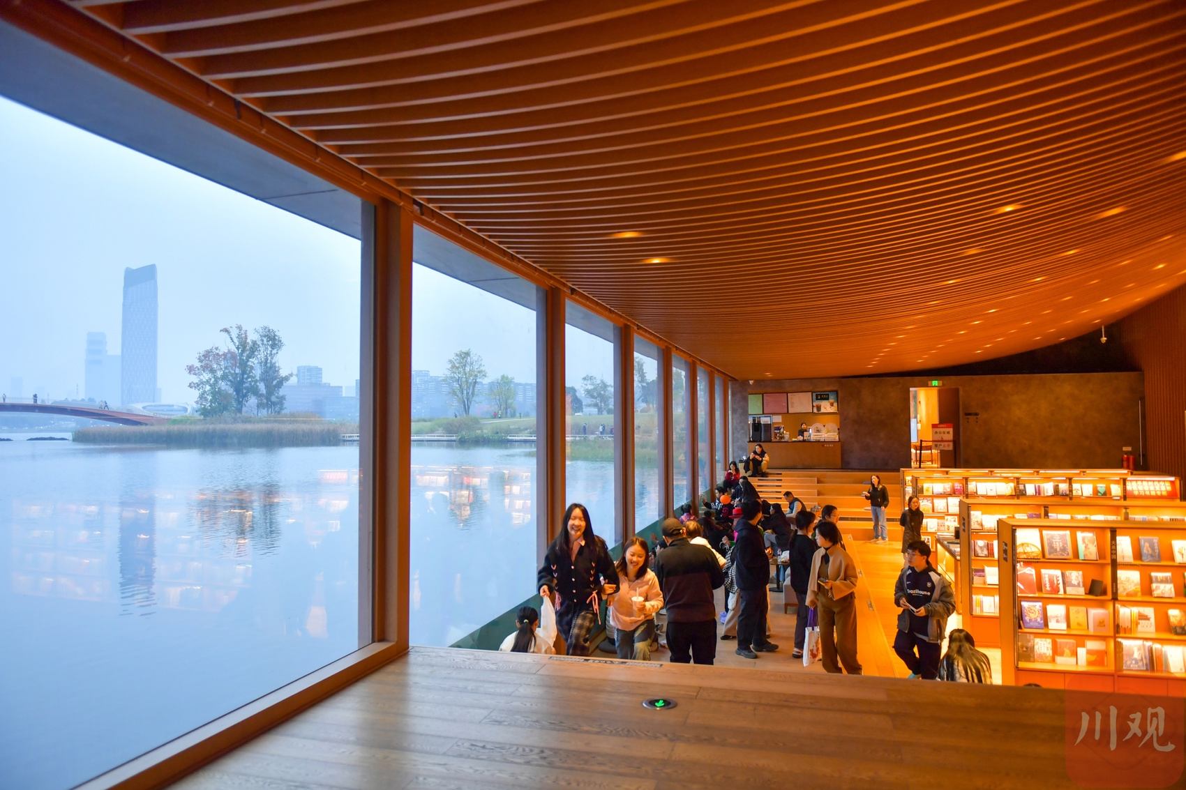 位于四川天府新区成都科学城的兴隆湖畔,市民在“水下书店”休闲。