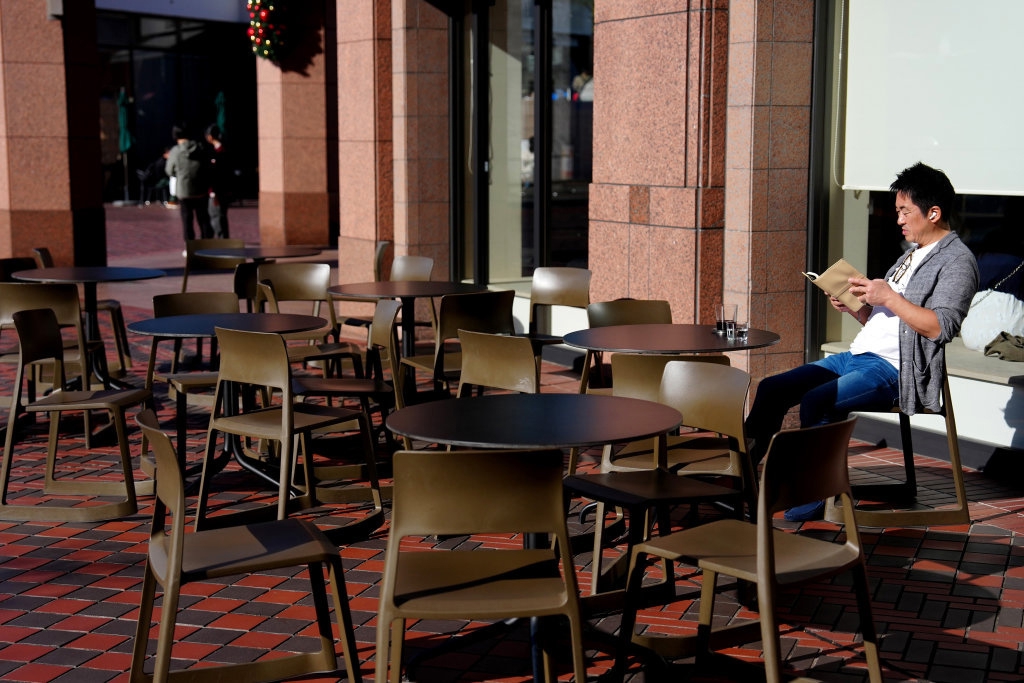 11月17日,一名男子在日本东京的一家咖啡店外休憩。