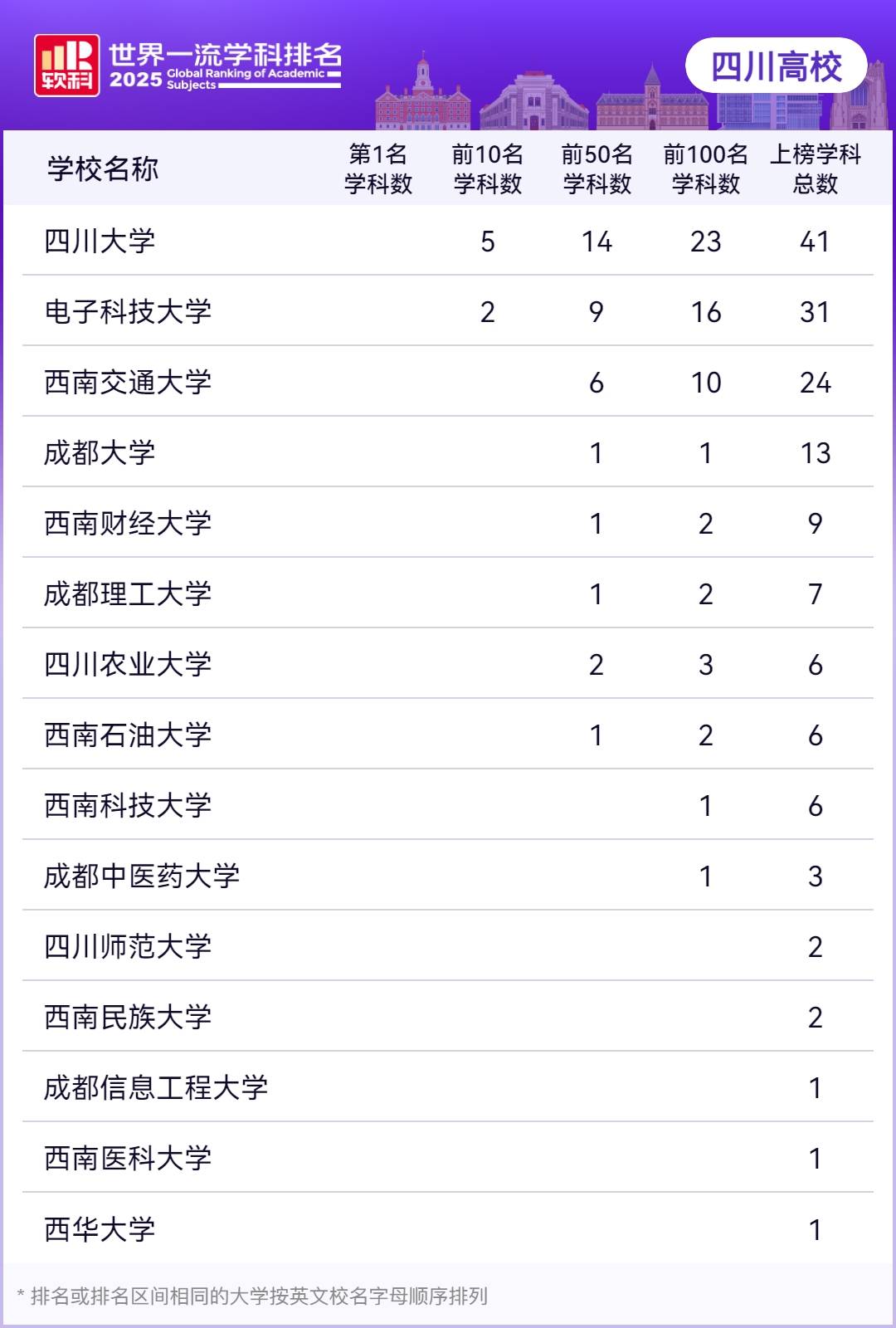 在2025软科世界一流学科排名中,四川高校表现亮眼,15所高校的153个学科榜上有名。从上榜学科总数来看,四川大学领跑全省,有41个学科上榜。电子科技大学紧随其后,上榜学科31个。西南交通大学(24个)和成都大学(13个)的上榜学科数在10个以上。西南财经大学(9个)、成都理工大学(7个)、四川农业大学(6个)、西南石油大学(6个)、西南科技大学(6个)、成都中医药大学(3个)、四川师范大学(2个)、西南民族大学(2个)、成都信息工程大学(1个)、西南医科大学(1个)、西华大学(1个)等高校也均有学科上榜。