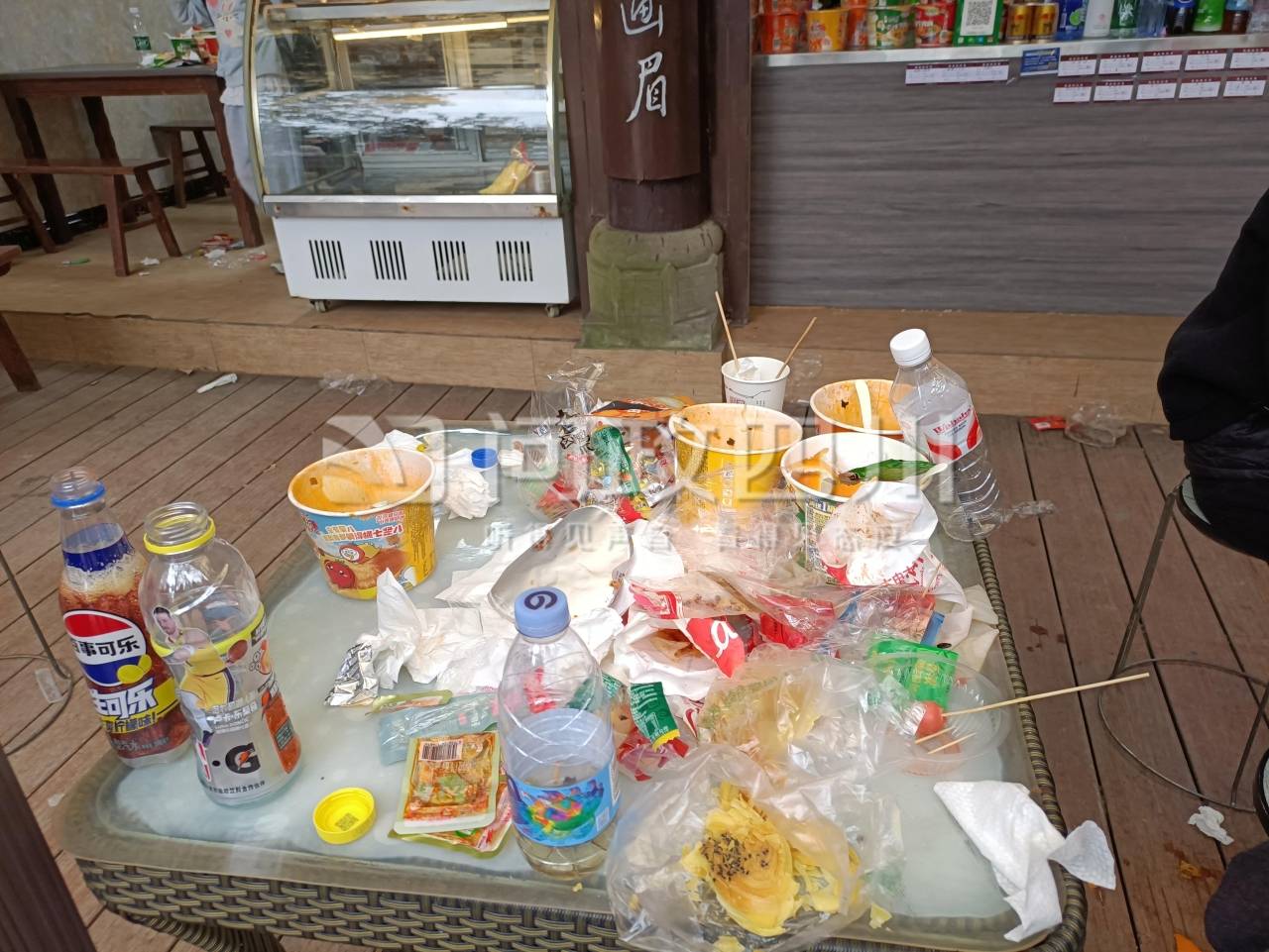 离开时,他拍下了当时的场景:景区商户门口的几张桌子上,放满了废弃的食品包装袋、泡面桶、饮料瓶、纸巾等物品。“给游客造成很不好的印象。”张波说。