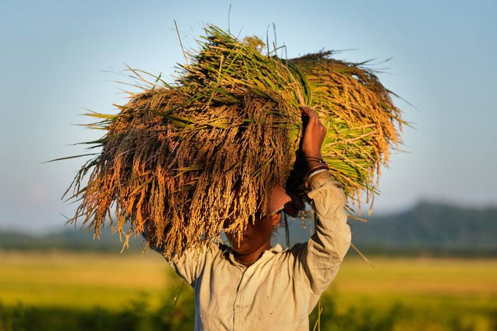 11月16日,在印度古瓦哈蒂郊区,一位农民扛着收获的稻子。