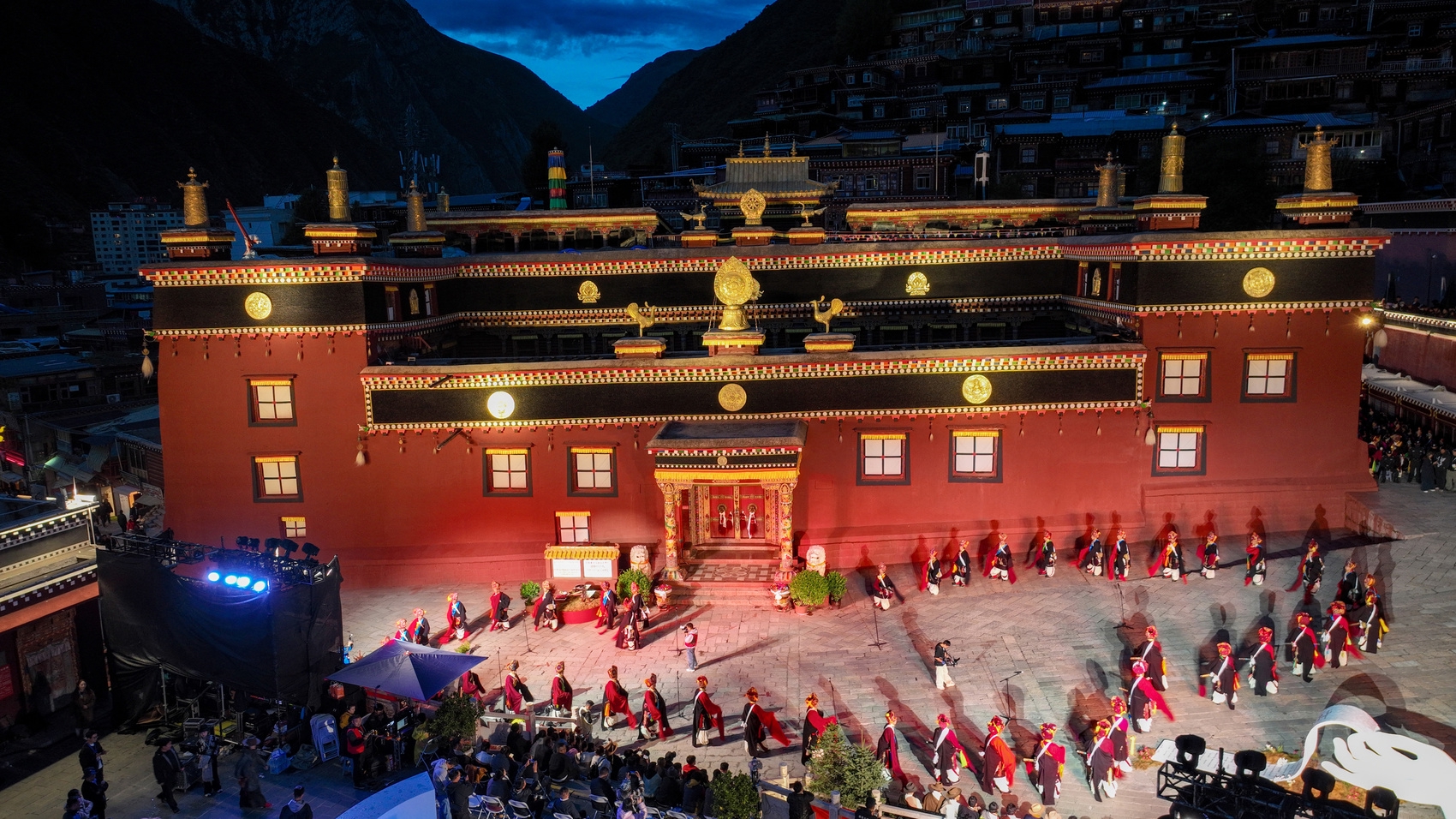 德格非遗卓且在印经院前上演。德格卓且于2008年被列入第二批国家级非物质文化遗产扩展名录。(洛绒尼玛 摄)