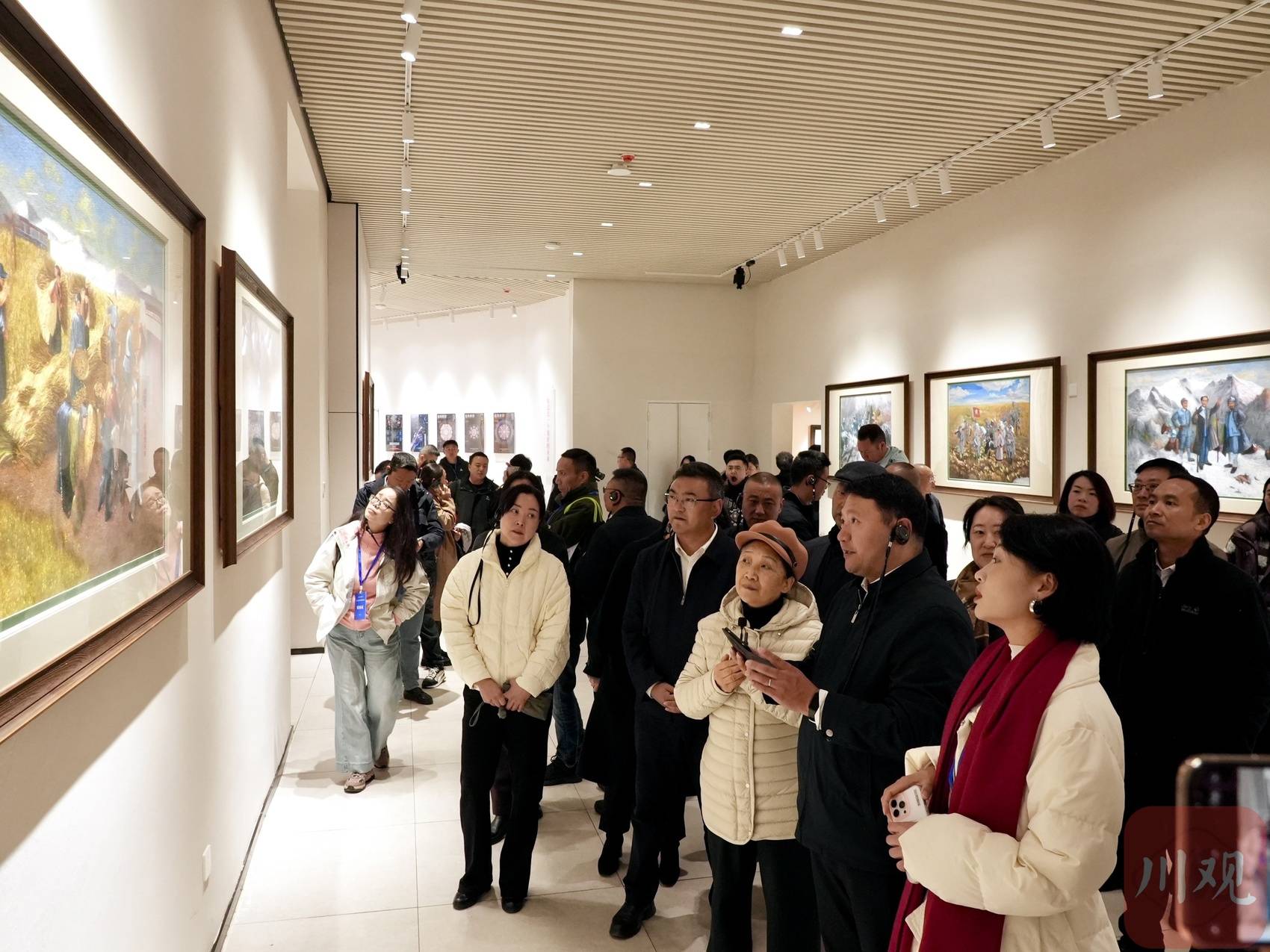 游客们观看博物馆内展出的羌绣作品《奉献》。