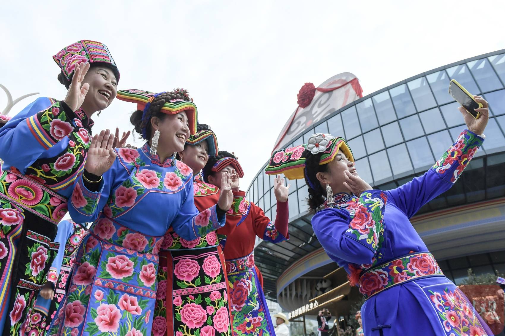 2025年11月20日,在四川省阿坝州汶川县映秀镇,当地羌族群众穿着盛装合影庆祝羌年。
